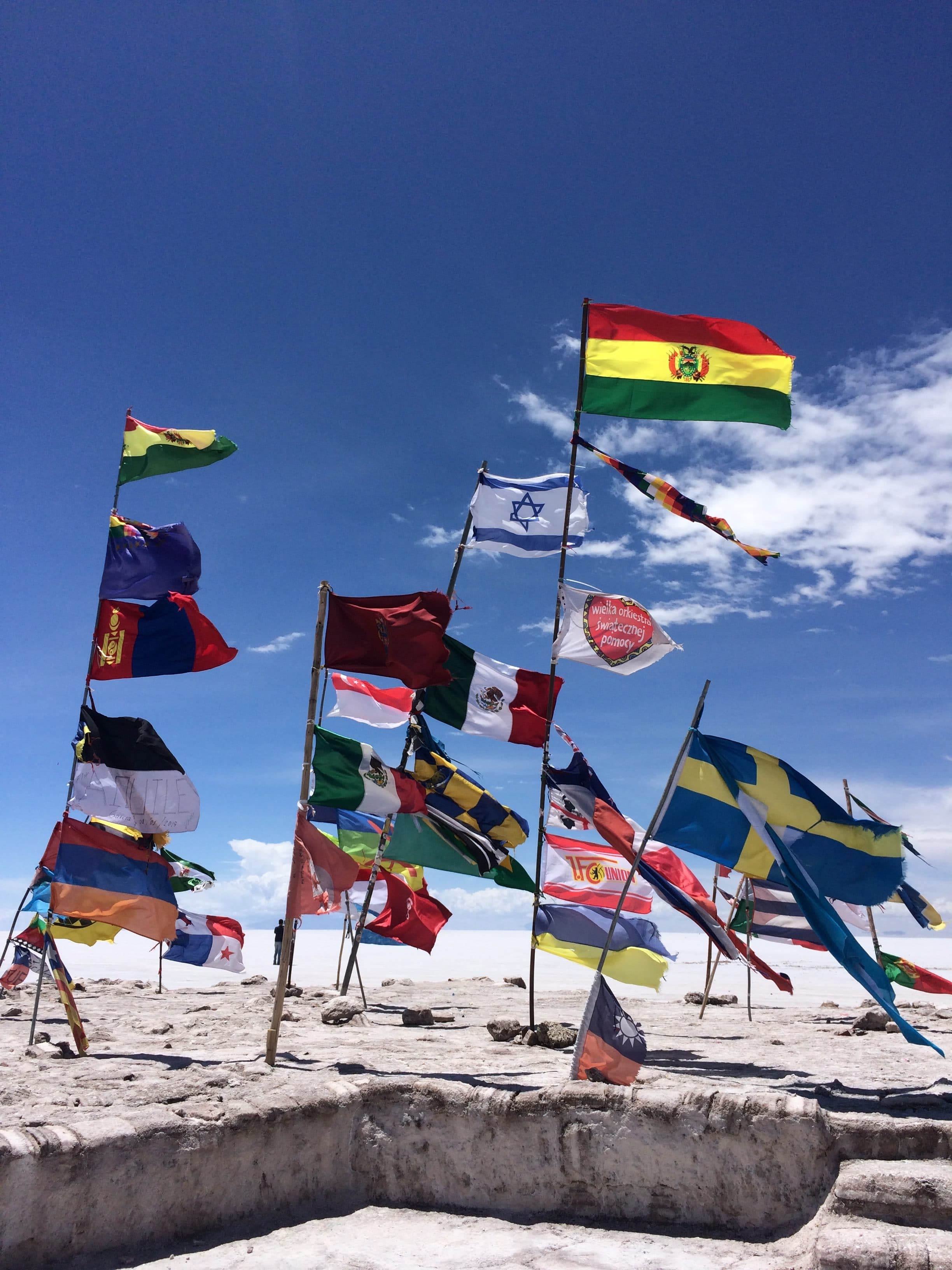 …del antiguo hotel de la sal y un montón de banderas frente a él..