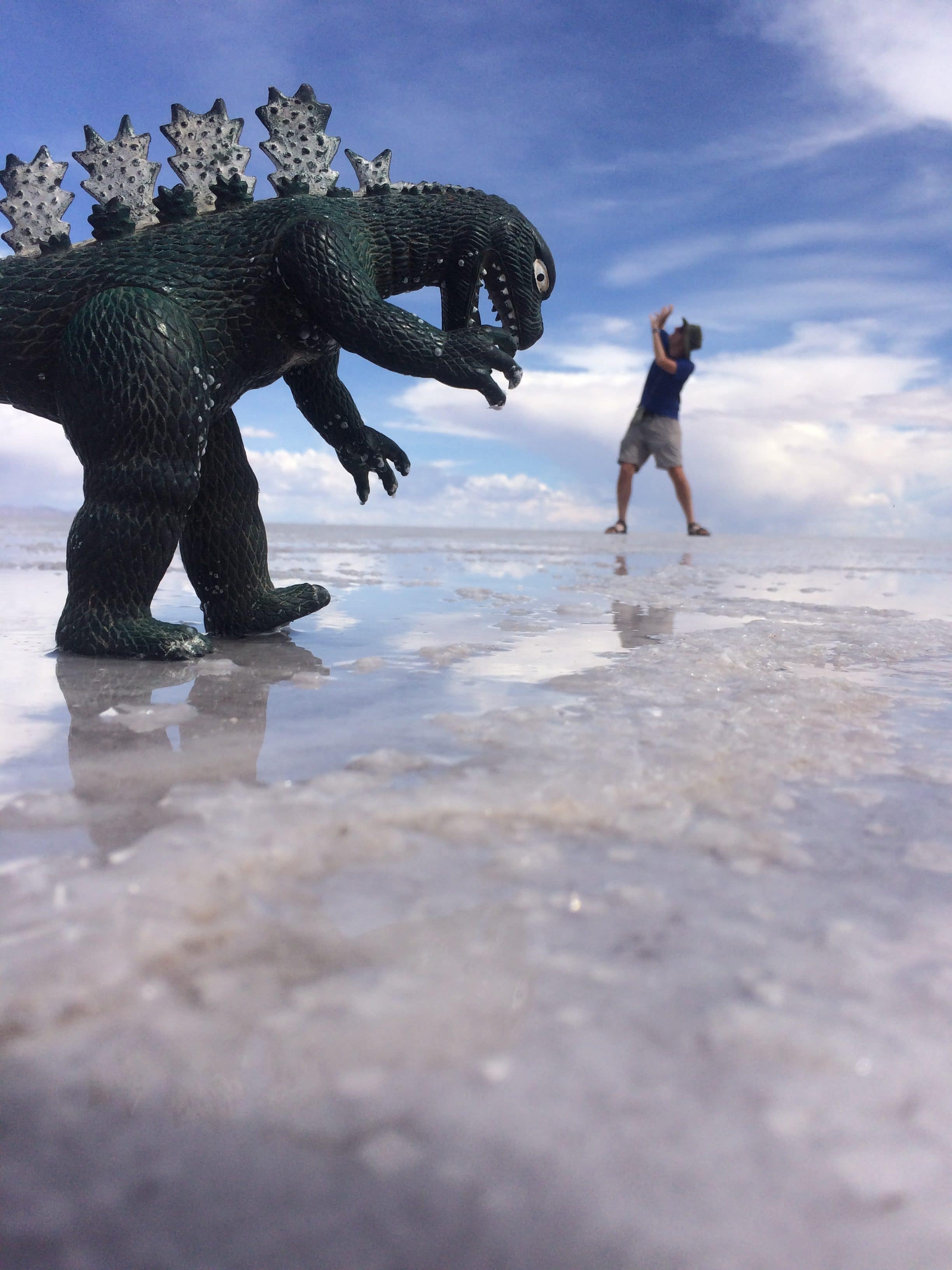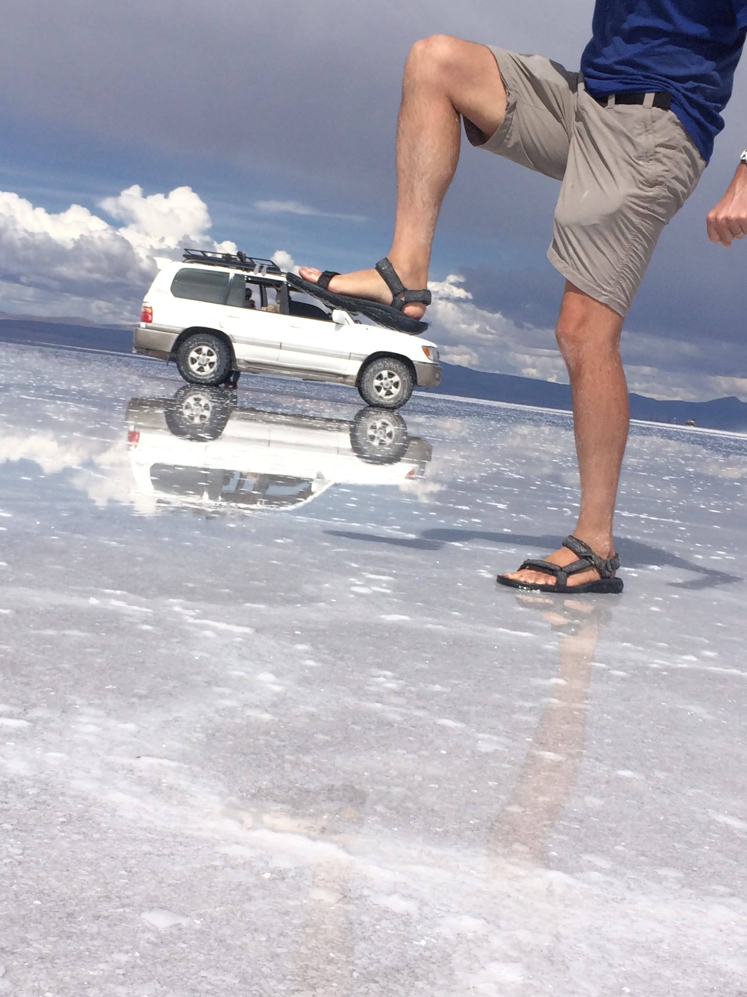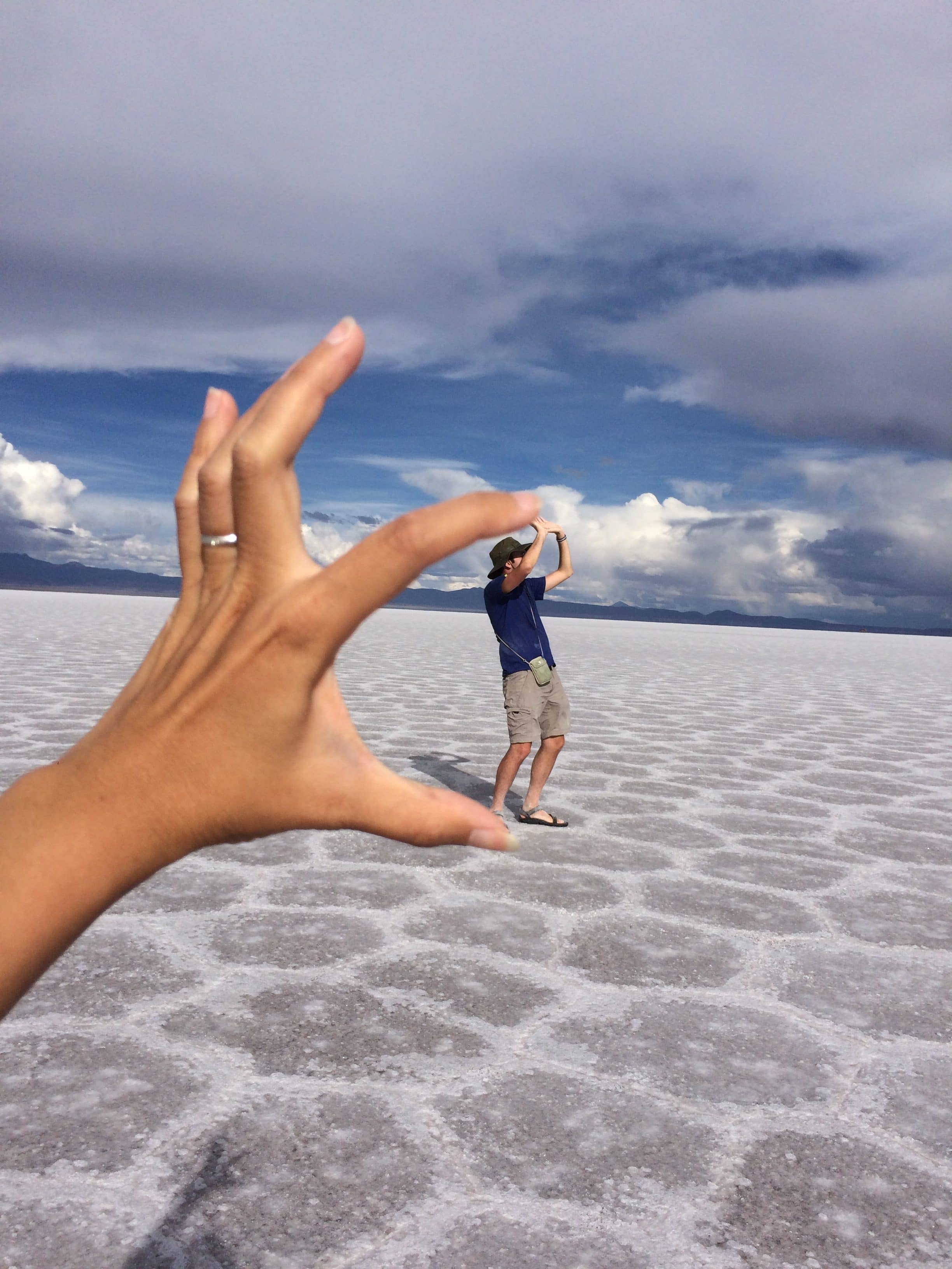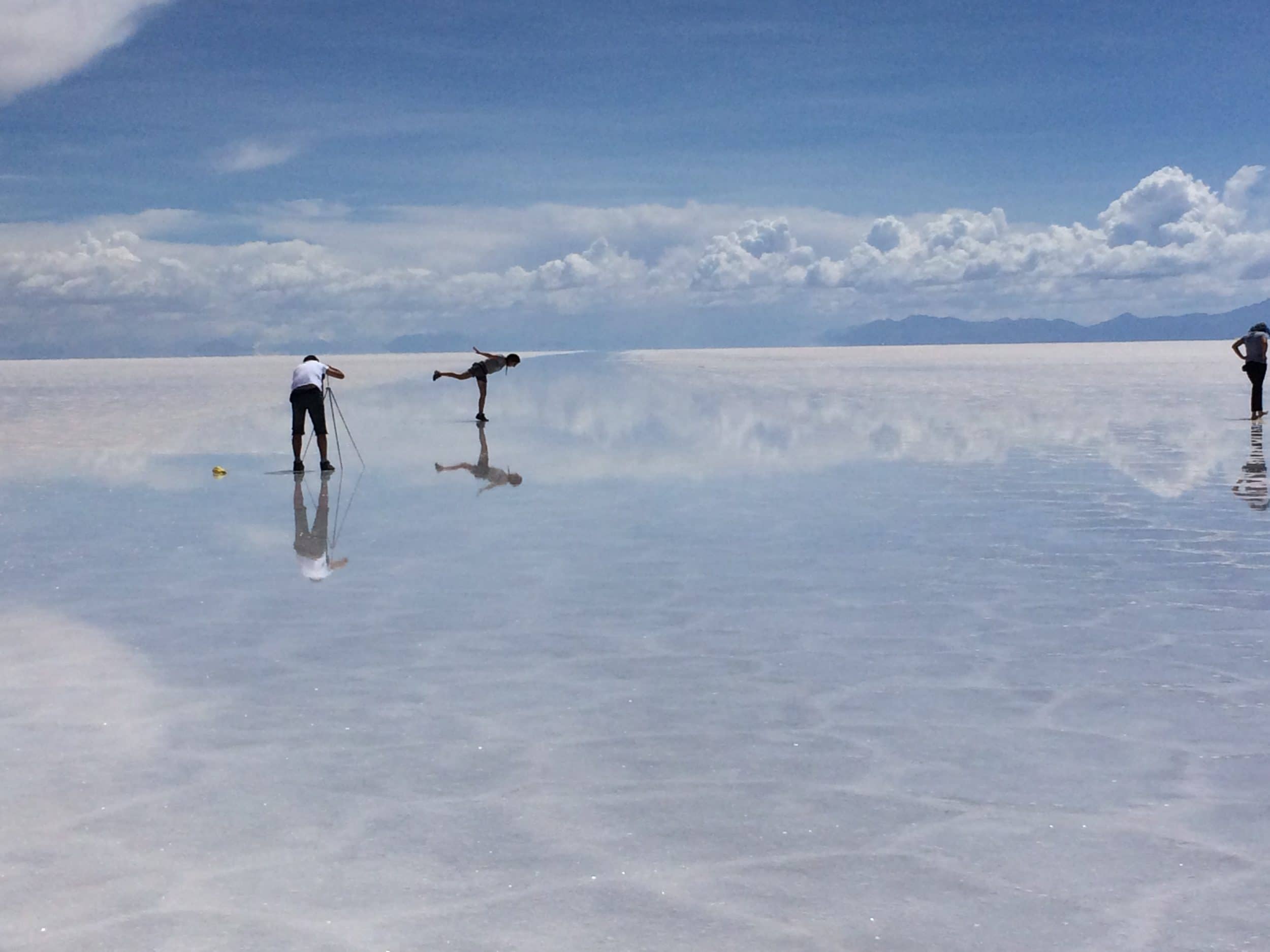 Todo el mundo se dedica a hacer fotos más o menos artísticas, pero estamos un poco limitados por la anchura de la placa de agua. La sal no está lo suficientemente seca como para hacer fotos en perspectiva