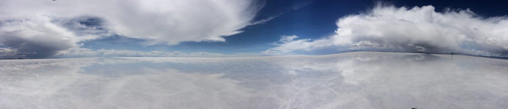Para esperar la puesta de sol, acabamos en una zona completamente inundada, el agua llega hasta el tobillo lo que desanima a nuestros dos turistas chinos que prefieren quedarse en el coche. Tenemos agua a 360 grados y, gracias a la planitud del desierto de sal, el cielo y las montañas se reflejan perfectamente en la superficie del agua, creando un paisaje increíble en el que ya no se distingue el horizonte. Aunque rebuscamos en nuestros recuerdos, nunca hemos visto un espectáculo tan extraordinario. Seguimos diciendo «ohhh» «woooow». Las fotos no hacen justicia (aunque ya son muy bonitas). ¿Cómo puedo explicar esto? Es como el cielo, o el cielo volando, estamos en las nubes, estamos en algún lugar… pero no en la tierra, ¿ves lo que quiero decir, eh, eh?