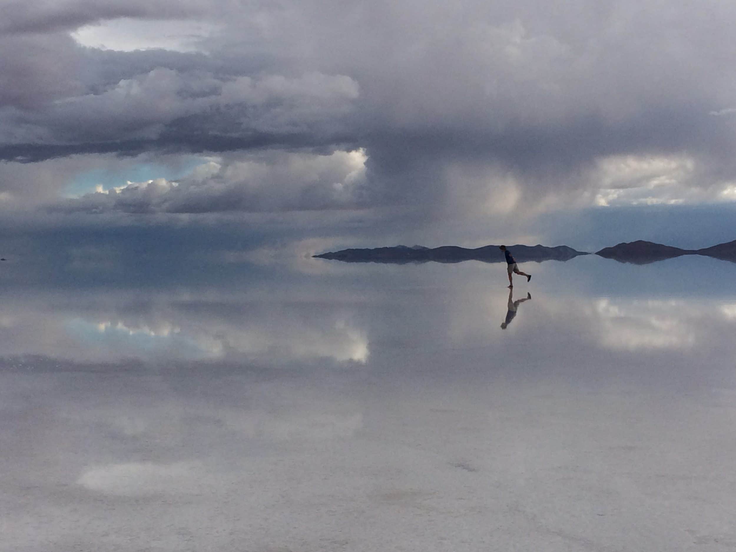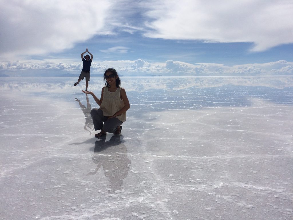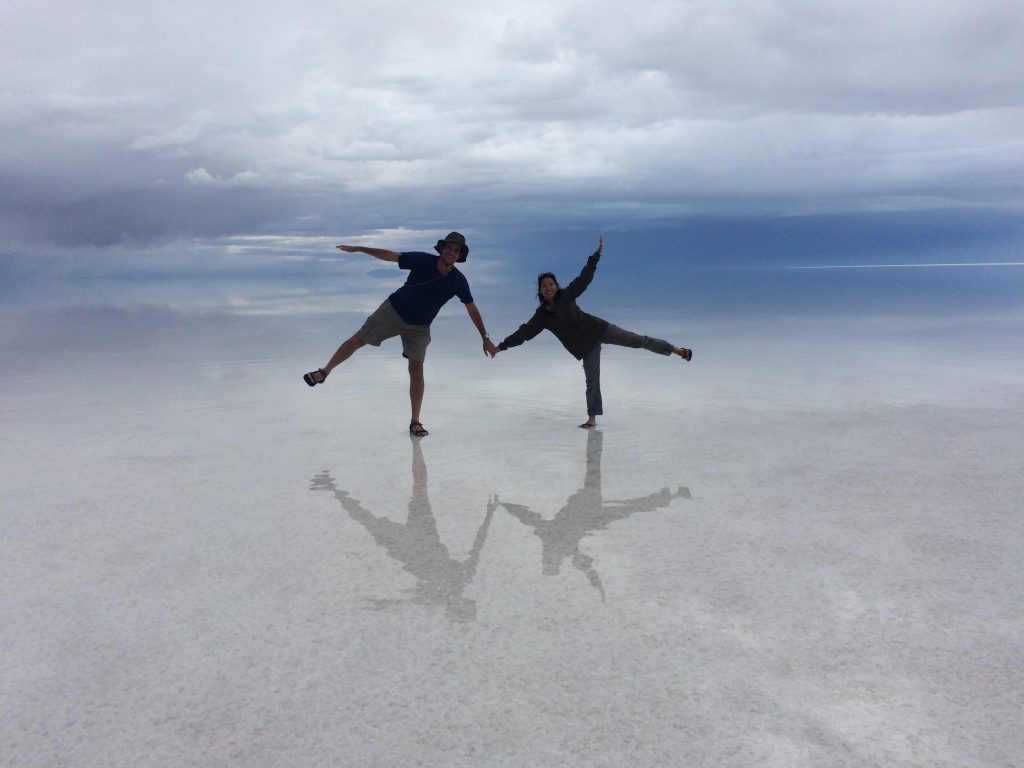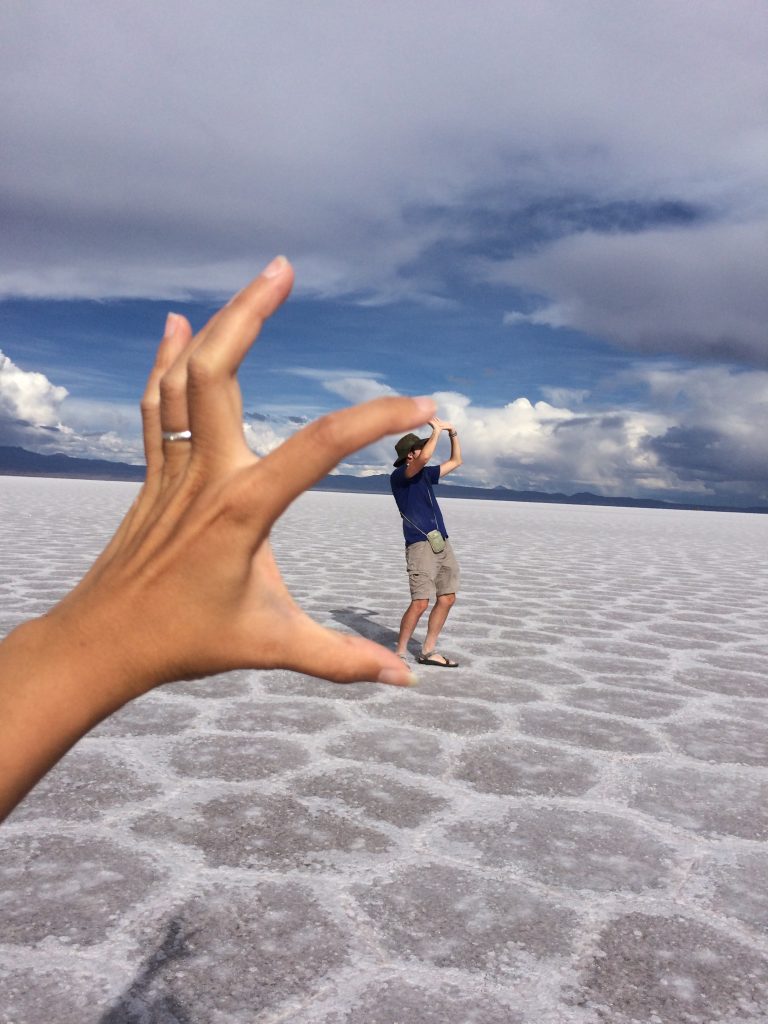 Siempre supimos que teníamos que venir aquí a mediados de enero, cuando el salar está inundado pero la lluvia es sólo temporal. Porque visitar el salar cuando llueve seguro que no es una experiencia agradable, cuando sabemos que el juego favorito de los turistas en el salar es hacerse fotos jugando con las perspectivas. Hay comentarios contradictorios sobre visitar el salar entre diciembre (cuando no es seguro que llueva) y febrero (cuando podría llover demasiado), así que para estar tranquilos, cortamos la pera por la mitad y marcamos en nuestra agenda, en cuanto se establezca el itinerario de la vuelta al mundo, que visitaremos el salar a mediados de enero. El azar ha querido que lo visitemos el 15 de enero de 2017!