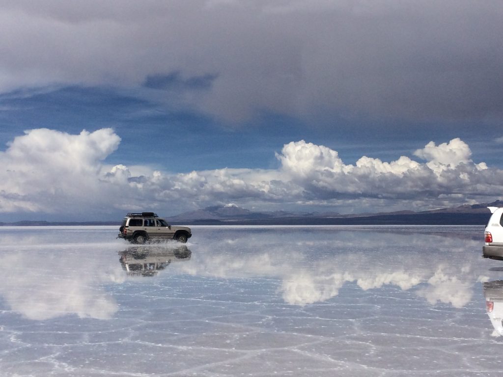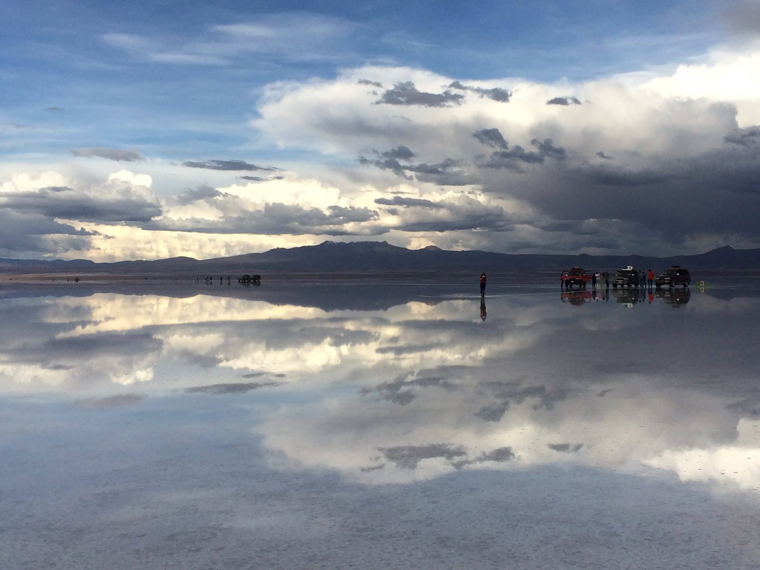 Después de comer, descubrimos con horror unos cincuenta jeeps aparcados frente al hotel de la sal. ¡Huyamos! El conductor nos pregunta dónde queremos ir: ¿dónde hay agua o no hay agua? La respuesta es unánime: ¡agua ! Conducimos durante un buen rato antes de encontrar una gran mancha de agua. No hay absolutamente nadie alrededor, ¡estamos solos en el mundo! A pocos kilómetros, está lloviendo, y estamos súper contentos porque significa que podríamos tener más agua en unas horas