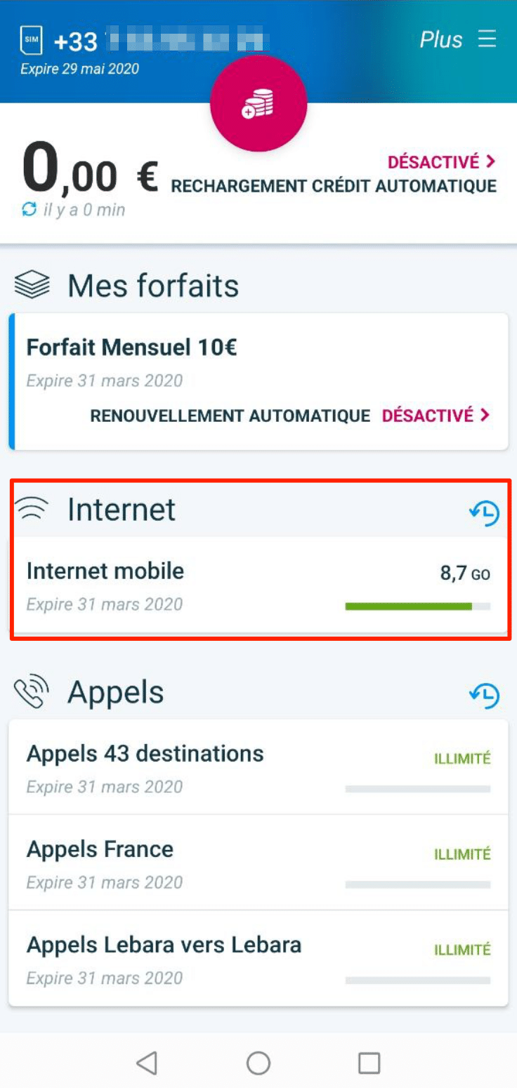 - La tarifa plana mensual a 10 euros: 10 GB de datos + llamadas ilimitadas a Francia y a 43 países + SMS ilimitados. Este paquete se renueva cada 30 días, pero la renovación automática se puede desactivar muy fácilmente a través de la aplicación. Válido durante 30 días.