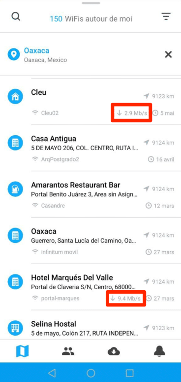 En este ejemplo, en Oaxaca, México, la aplicación enumera 150 puntos wifi, algunos de ellos con pruebas de velocidad de descarga.