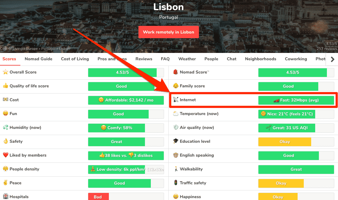 Nomadlist es un sitio web muy conocido por los nómadas digitales para evaluar la pertinencia de una ciudad con nuestro modo de vida: el clima, el coste de la vida, la seguridad, … y la velocidad de conexión a Internet.
