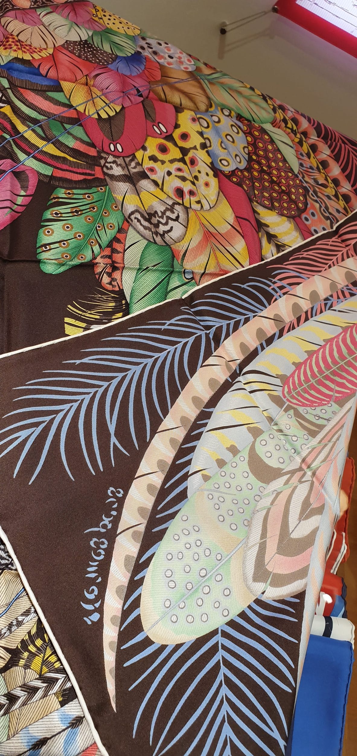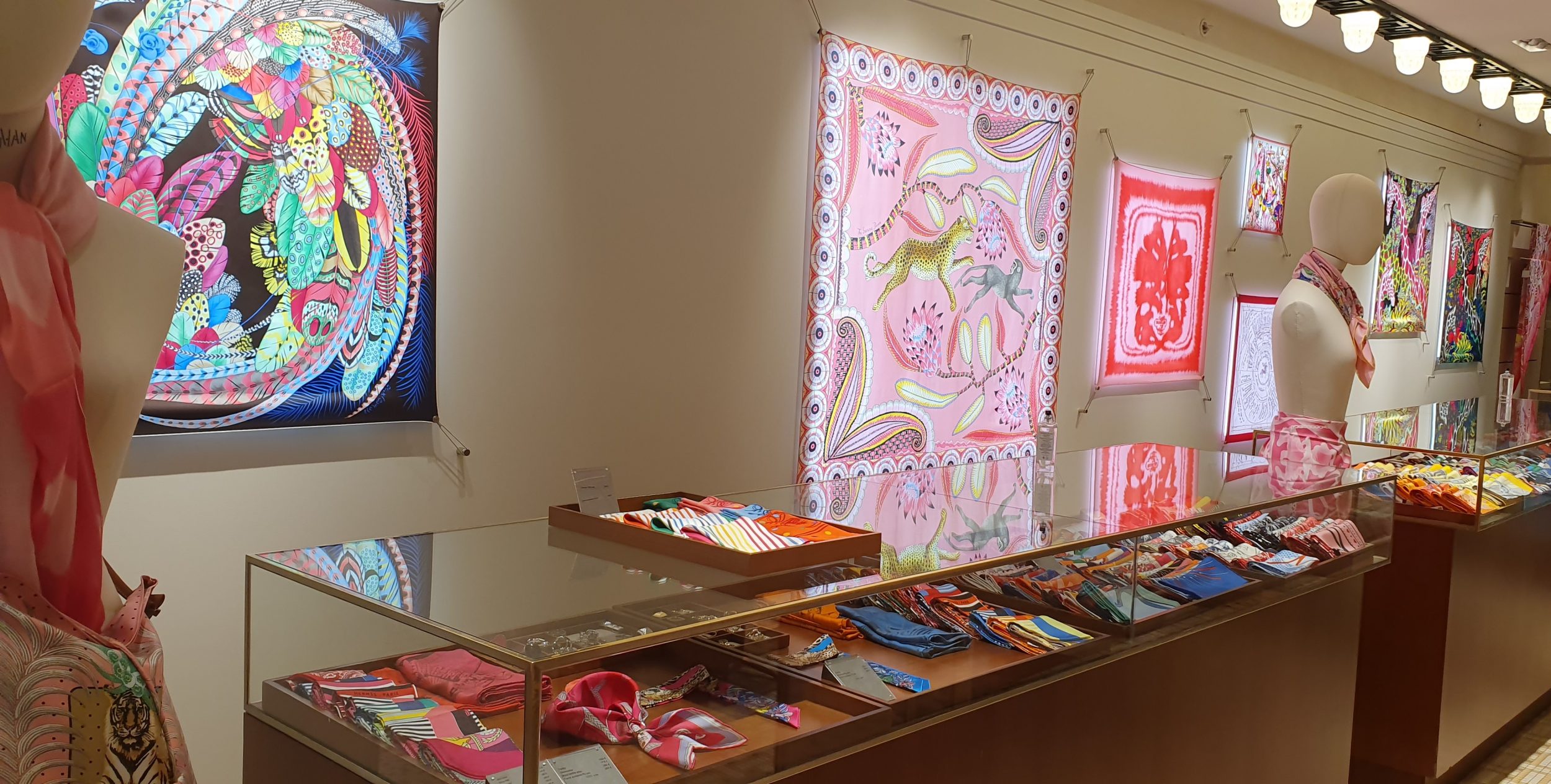 Para ayudarnos en nuestra elección, los cuadros de la nueva colección se destacan como objetos decorativos. Esto le permite ver los detalles e inspirarse. El modelo que había visto «Feathers in celebration», estaba disponible y destacado también. Al lado, hay bustos de maniquíes, en los que las vendedoras nos enseñan a anudar un cuadrado Hermès…