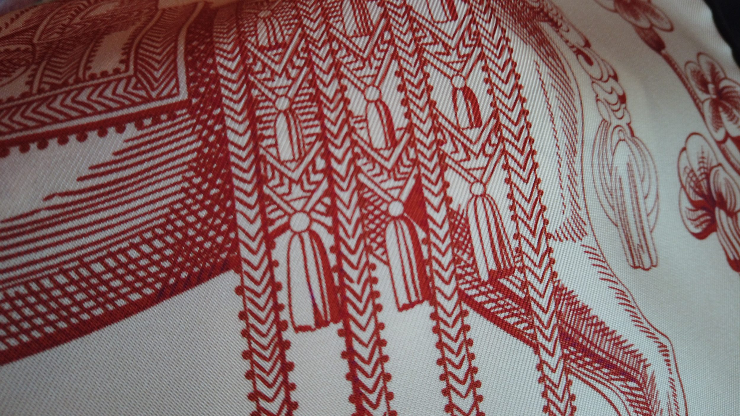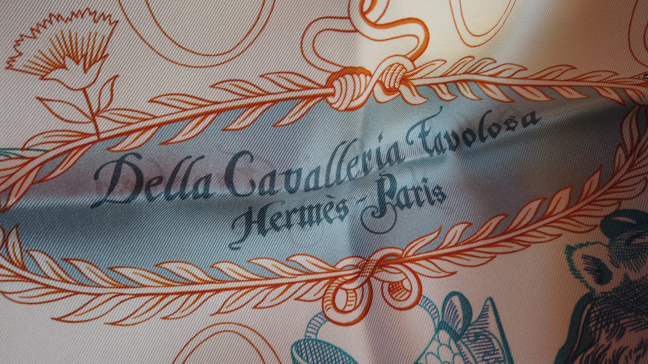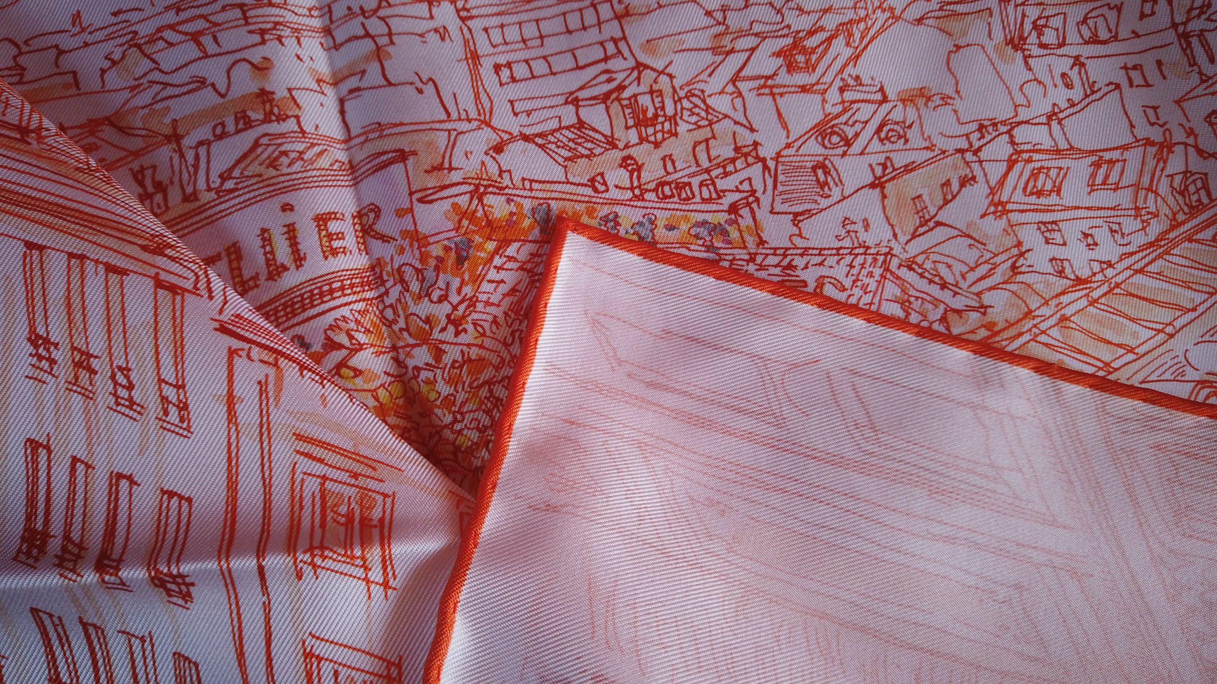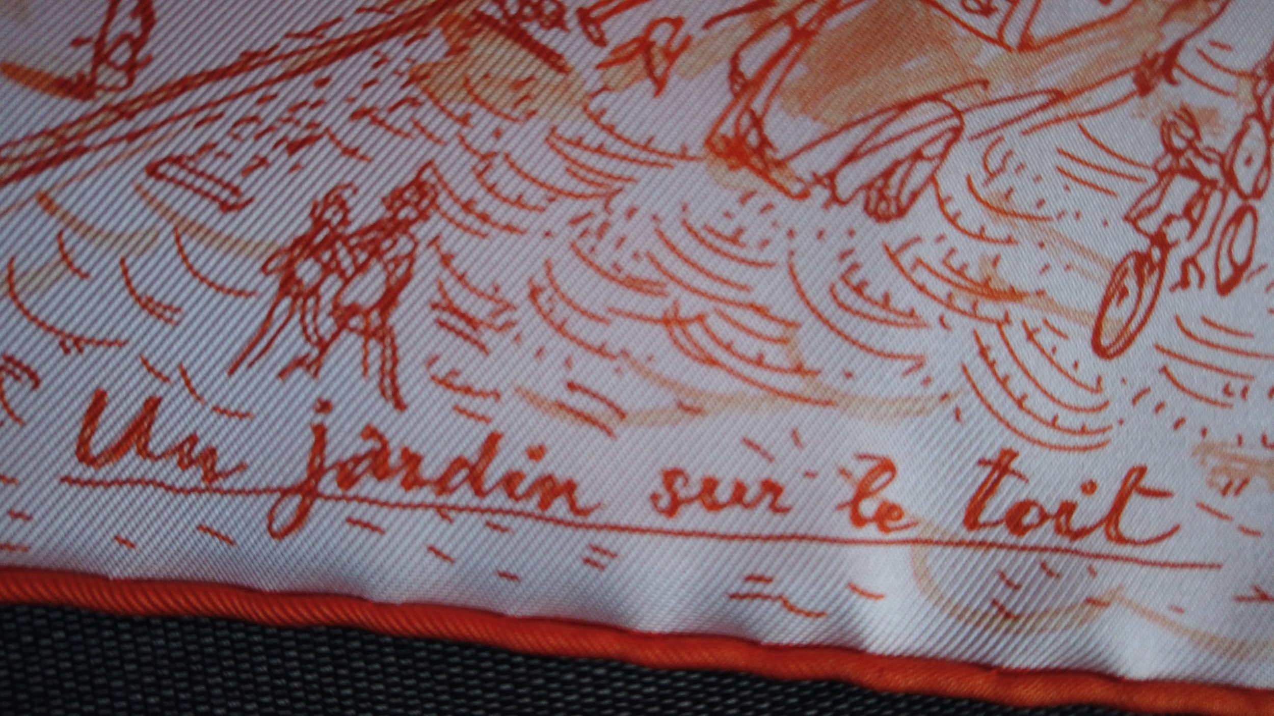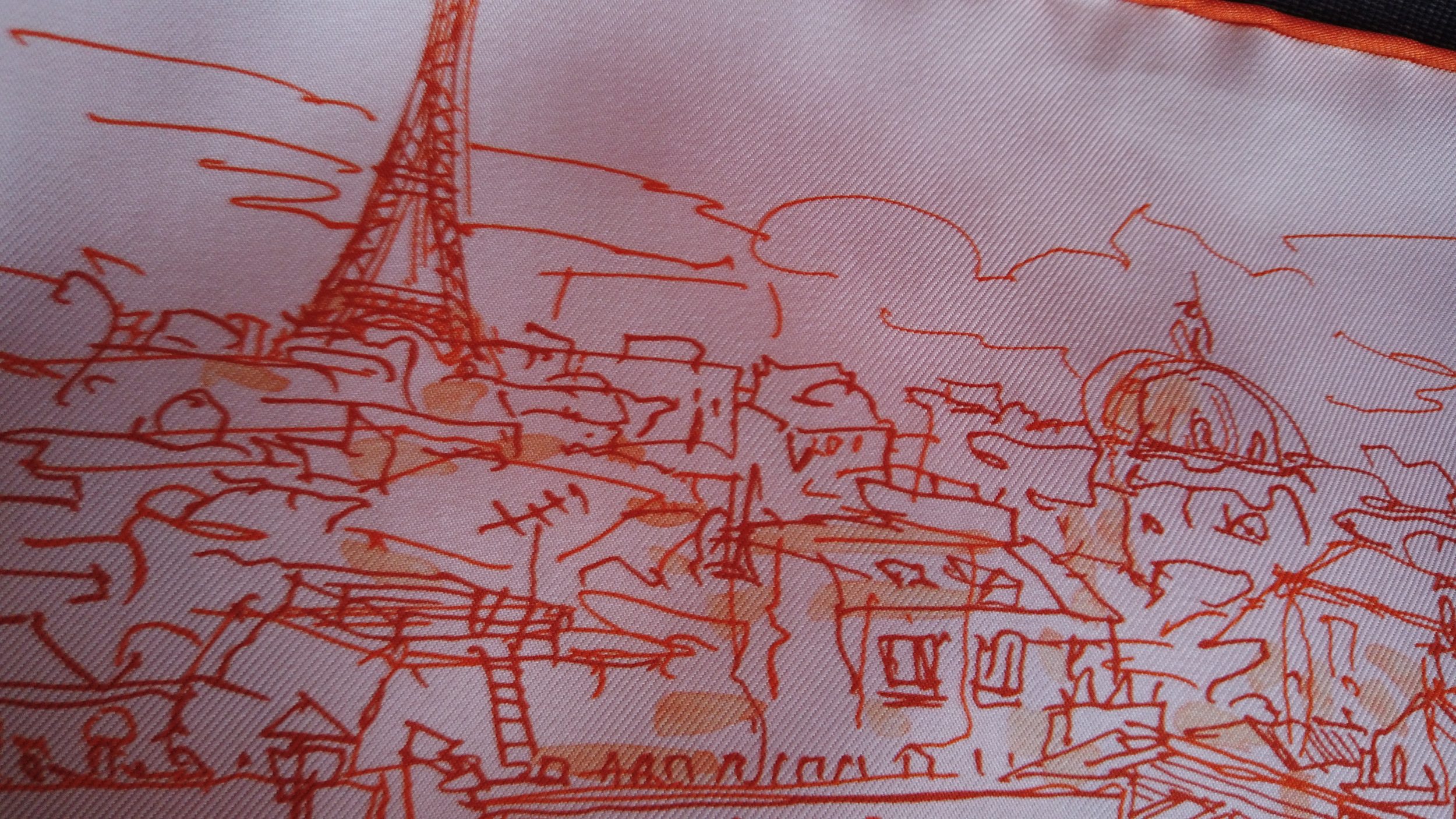 Como comparación, a la izquierda puede ver un nuevo cuadrado, tejido y fabricado en Francia (en Lyon, como Hermès), también en sarga de seda pero que cuesta 4 veces menos que Hermès. Se puede ver que los colores «babean», la seda es menos gruesa, mientras que en Hermès (a la derecha), la seda es mucho más brillante, más gruesa y los colores son claros y precisos, no babean en absoluto.