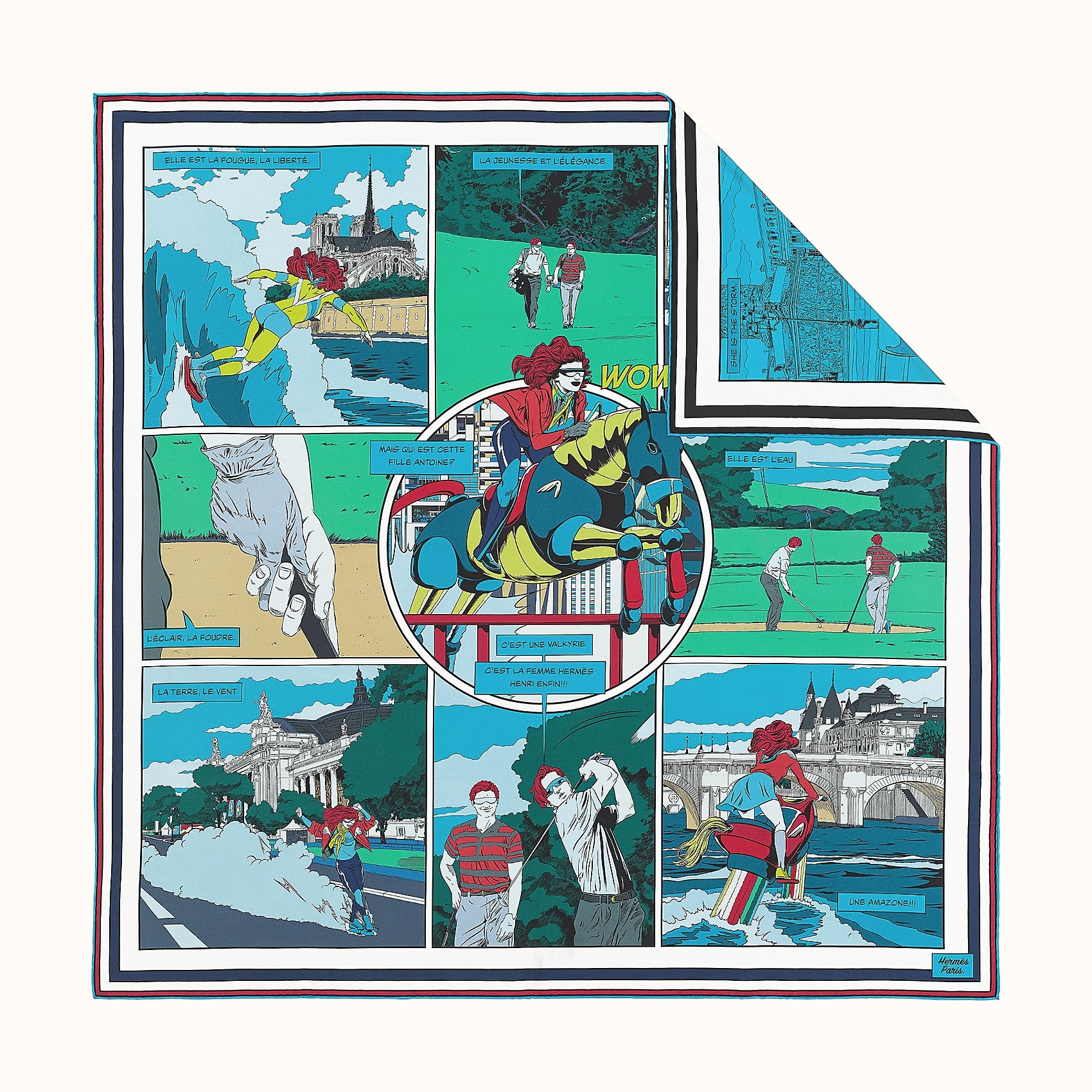 Creo que es necesario venir a verlas en la vida real, porque son realmente hermosas, y completamente diferentes de las plazas clásicas. Cuando se produjeron las filtraciones sobre estos cuadrados de doble cara, la gente tenía miedo de que se cosieran dos capas muy finas de seda, o de tener que pagar el doble que un cuadrado estándar. Pero la realidad es muy distinta: cada cuadrado de doble cara cuesta 490 euros, frente a los 375 euros de un cuadrado estándar. Y el cuadrado de doble cara tiene el mismo grosor que un cuadrado estándar. Lo que ocurre es que la tinta se ha «detenido» en el centro en lugar de atravesar / empapar el reverso.