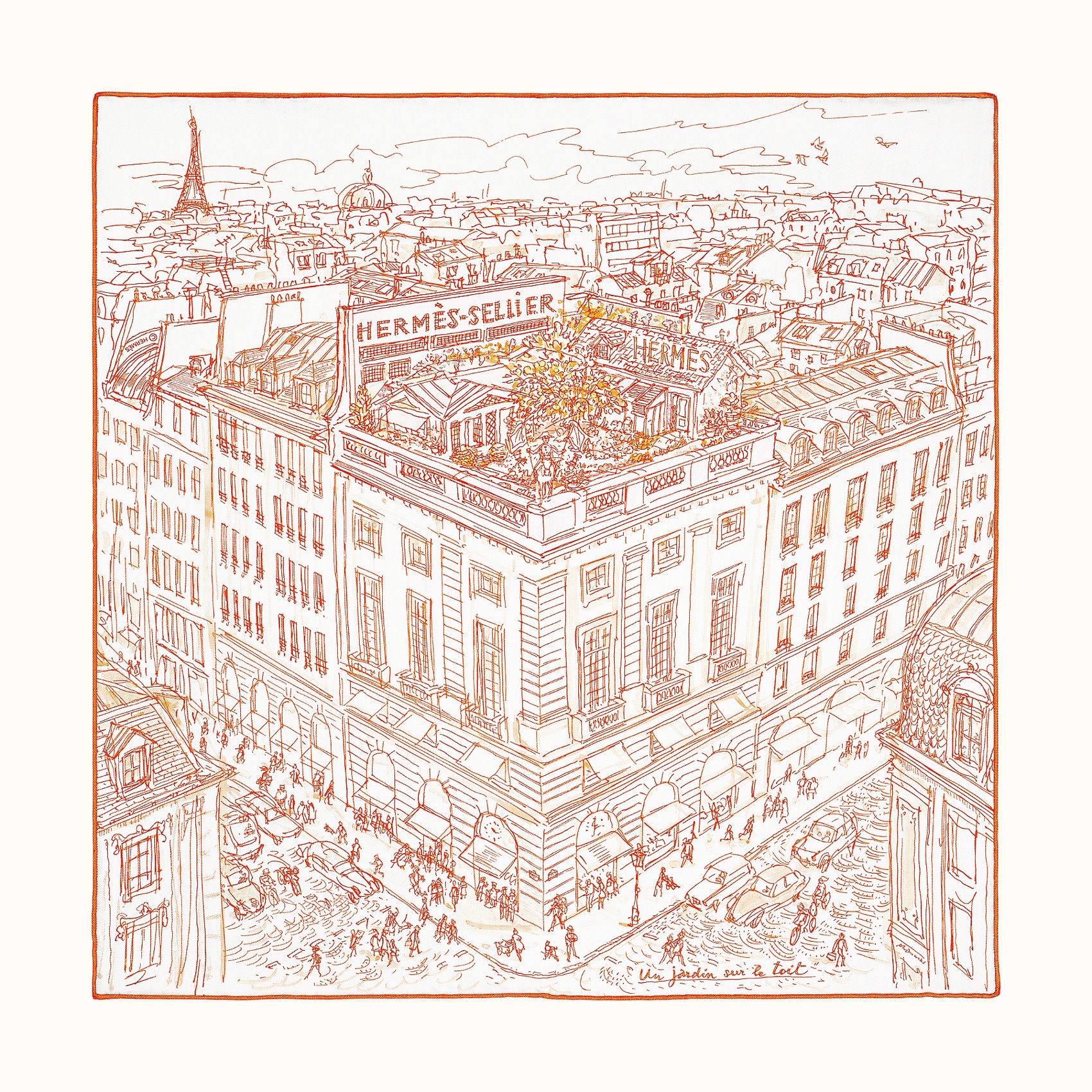 Un jardín en la azotea es, ante todo, esta terraza verde y arbolada del 24 de Faubourg Saint-Honoré. Existe desde mediados de los años 20, cuando Émile Hermès emprendió la elevación del edificio, la ampliación de la superficie de la tienda y de los talleres de cuero y la creación de un gabinete de curiosidades para su colección. Este jardín colgante, llamado el «vaso» de la casa, forma parte de su historia. Allí se fotografiaron modelos de costura a partir de los años 30, se cultivaron patatas para alimentar al personal durante la Segunda Guerra Mundial, Robert Dumas plantó allí un manzano y su hijo Jean-Louis decidió convertir esas manzanas en mermelada. En 1987, con motivo del 150 aniversario de la casa, se instaló en ella un jinete artificial La reseda, la impaciencia, los azafranes, el espino, la salvia, las rosas, los tulipanes, las manzanas… con el paso de los años, se han convertido en un auténtico «jardín del placer que hace lo que le da la gana y nos canta a amar la vida», dice el perfumista Jean-Claude Ellena cuando, en 2011, esta frondosa vegetación urbana le inspira para crear un eau de toilette. Philippe Dumas, que conoce este jardín desde su infancia, ha creado para la ocasión uno de sus diseños secretos, en una línea viva y encantadora.
