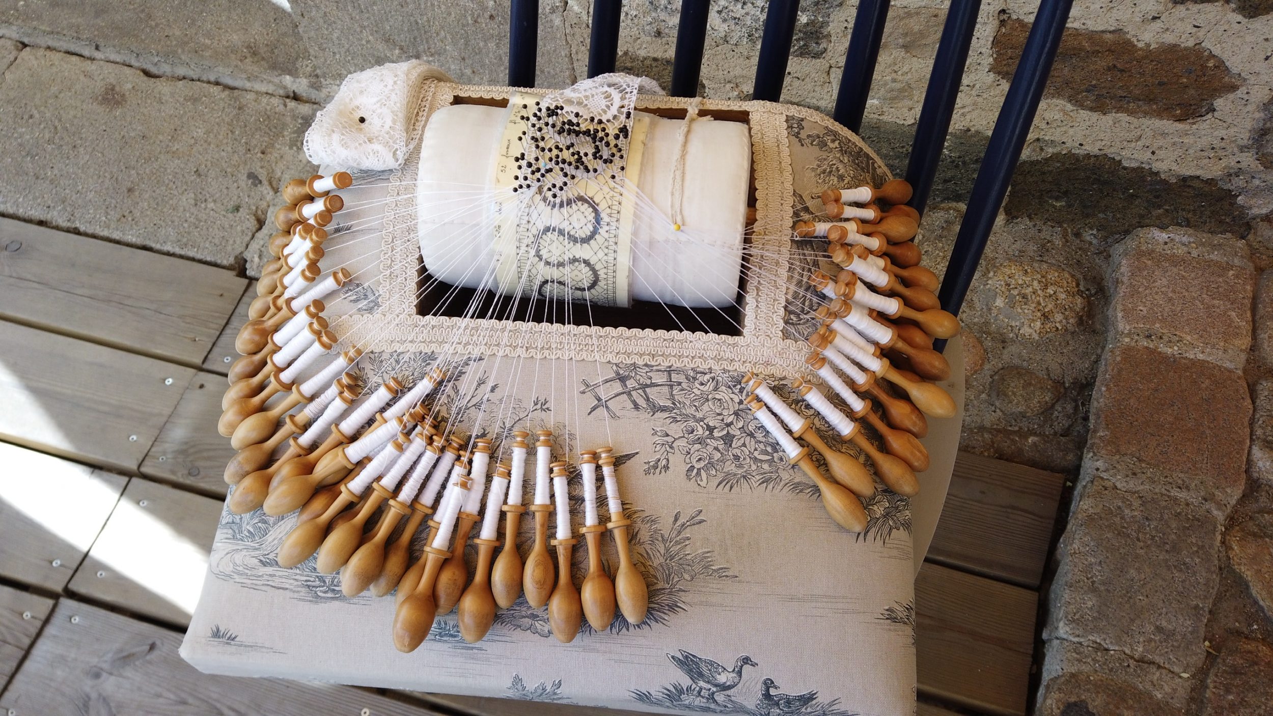 Para los principiantes, que comienzan con 4 husos, puede haber números 1,2,3,4… y el aprendizaje comenzará con una fórmula simple como: 1 de 3, 4 de 2, 2 de 3…etc. El conjunto se fija con alfileres (de lo contrario, no habría sido posible tener agujeros en el centro del encaje). Hace veintitrés años, durante la visita, tuvimos acceso a este modelo para principiantes y pude tejer yo mismo 2 mm de encaje 😀 Ahora creo que con el Covid, este tipo de demostración ya no estará disponible para los turistas, sea cual sea el centro de enseñanza. Las 4 direcciones que te he dado arriba ofrecen prácticas si estás interesado. Varía de unas horas a unos días. En mi lista de deseos, hay cursos de carpintería, marroquinería, impresión de telas y encaje de bolillos.