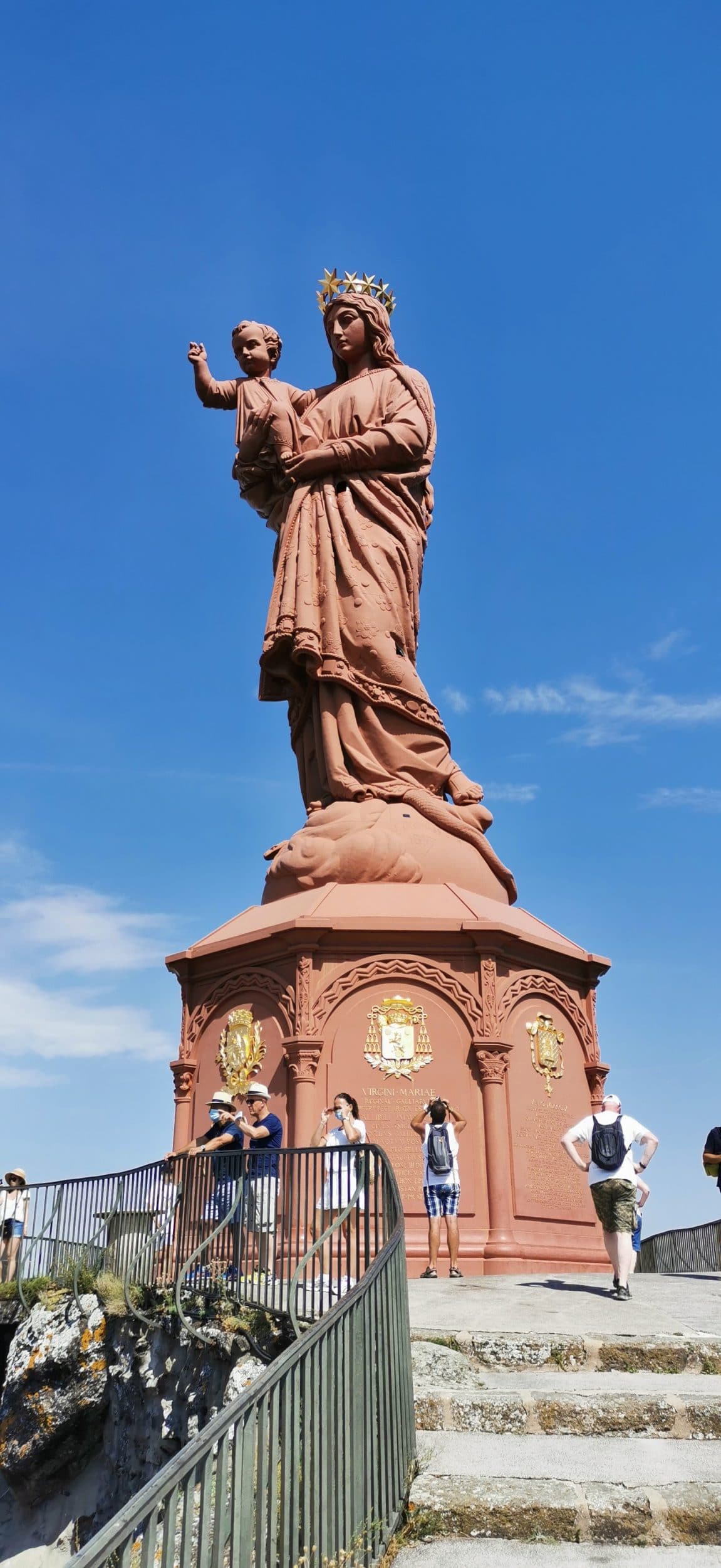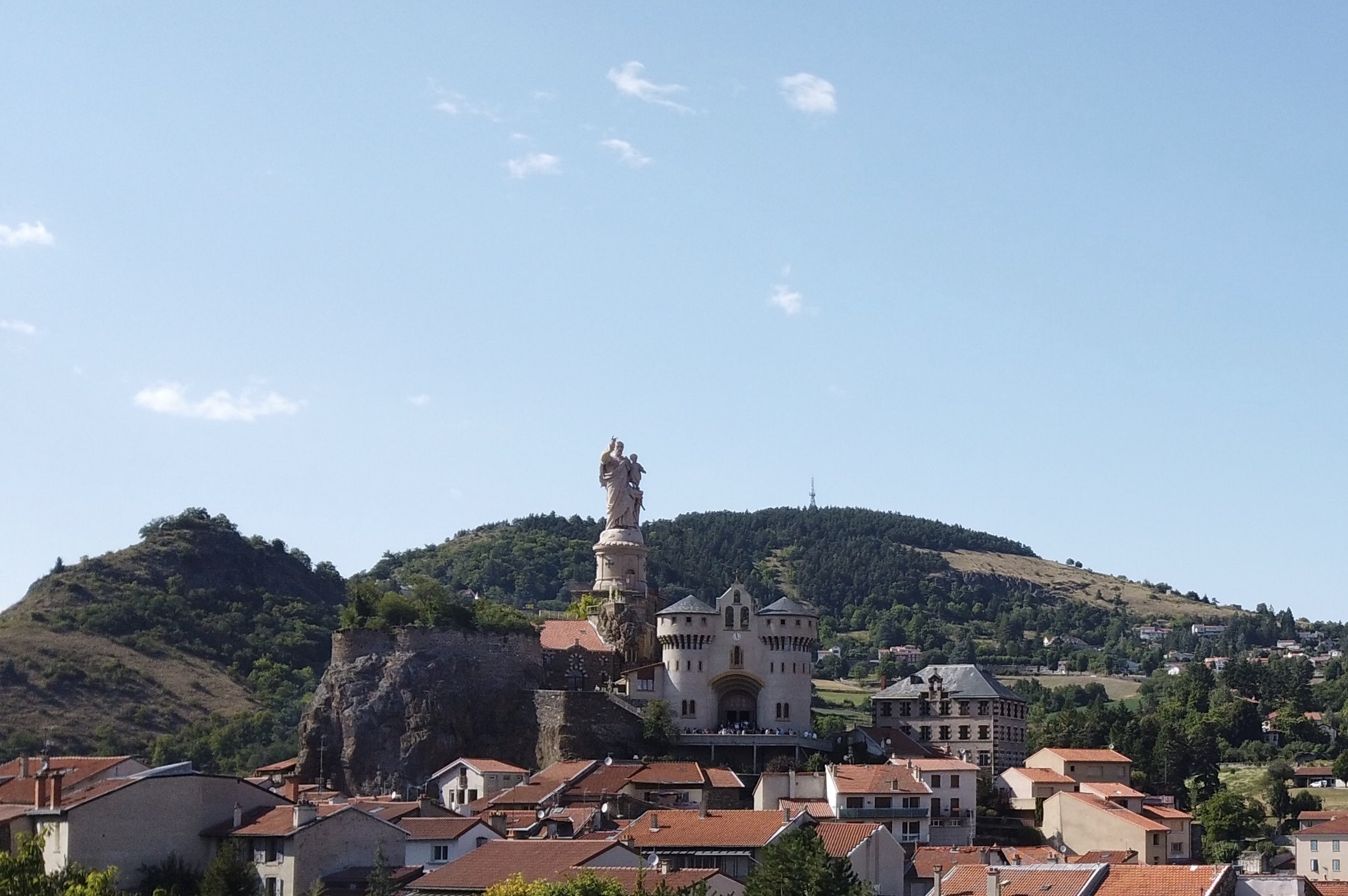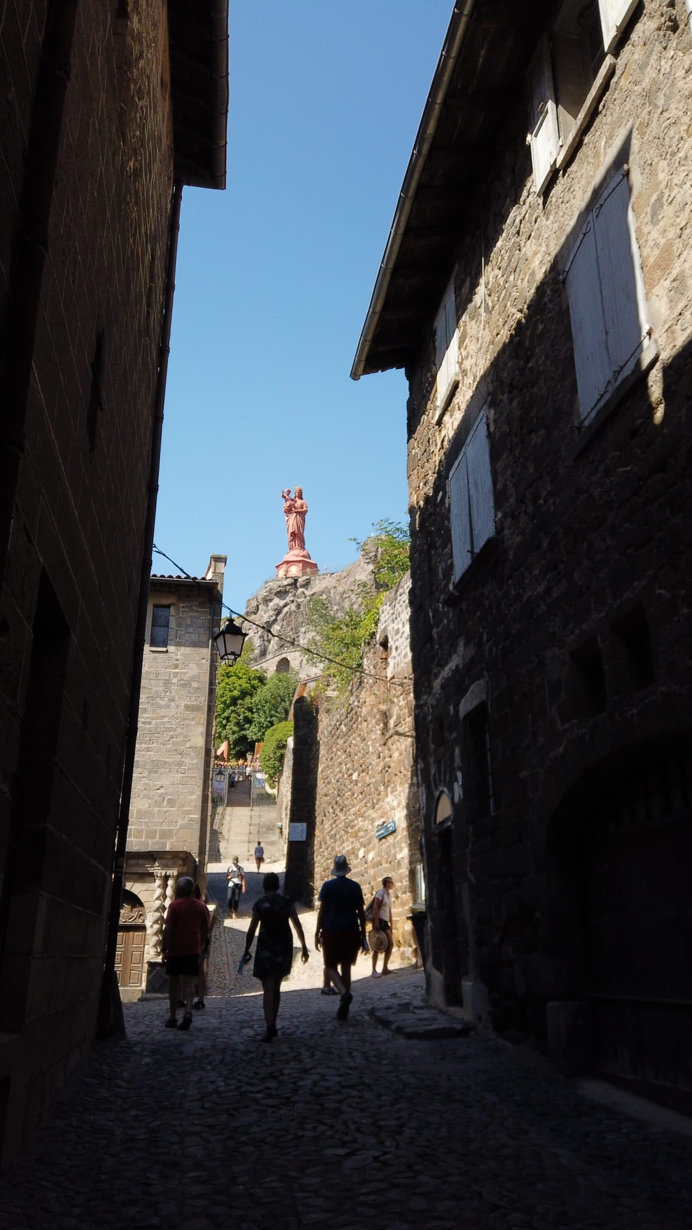 Al llegar a Le Puy-en-Velay, no puede perderse la estatua de Notre-Dame de France (a la derecha) ni la capilla Saint-Clair d’Aiguilhe (a la izquierda). Desde la distancia, ambos lugares parecen completamente inaccesibles, pero hay escaleras que llevan a la cima. No subí a la parte superior de la Capilla, pero para la Estatua, como se sube desde la Catedral, que ya está bastante alta, no sufrí demasiado a pesar de la ola de calor.