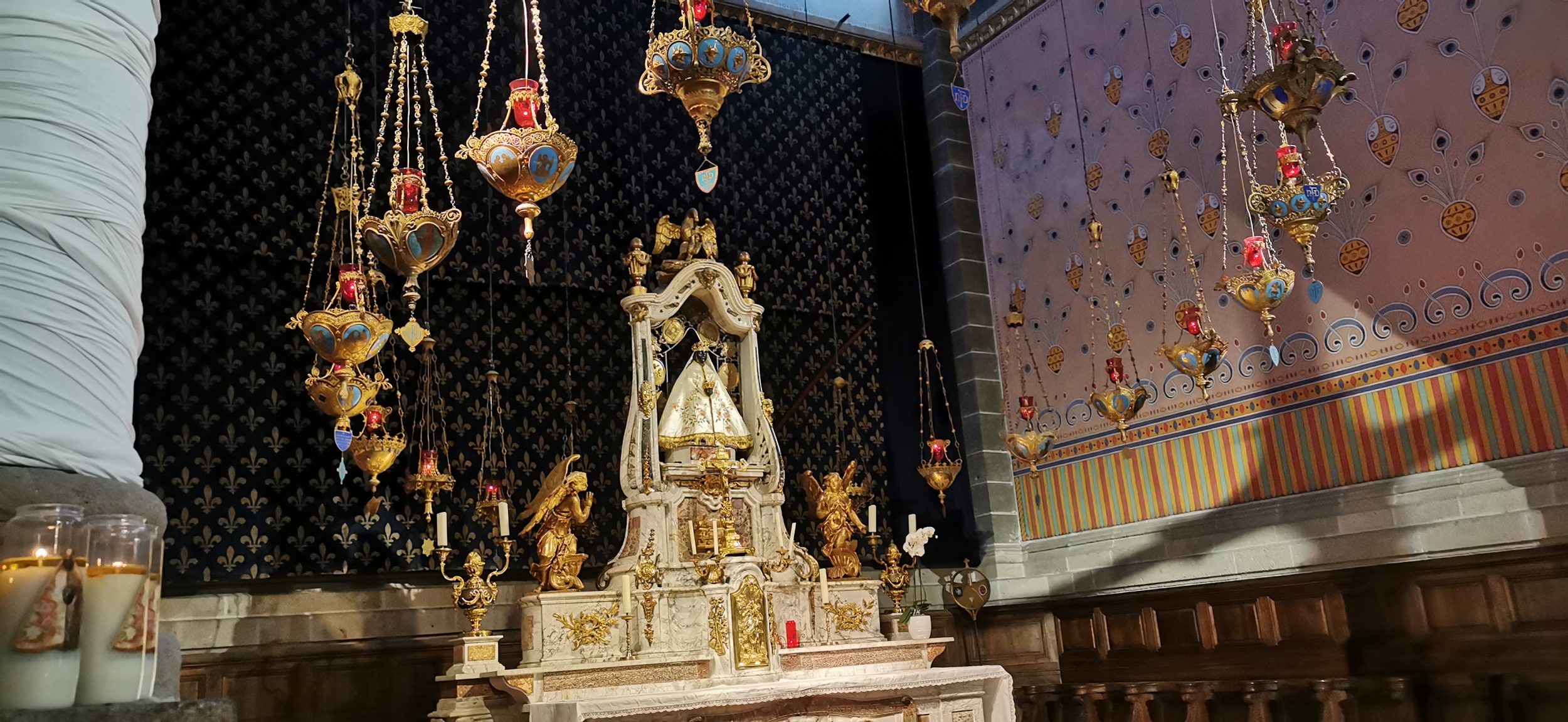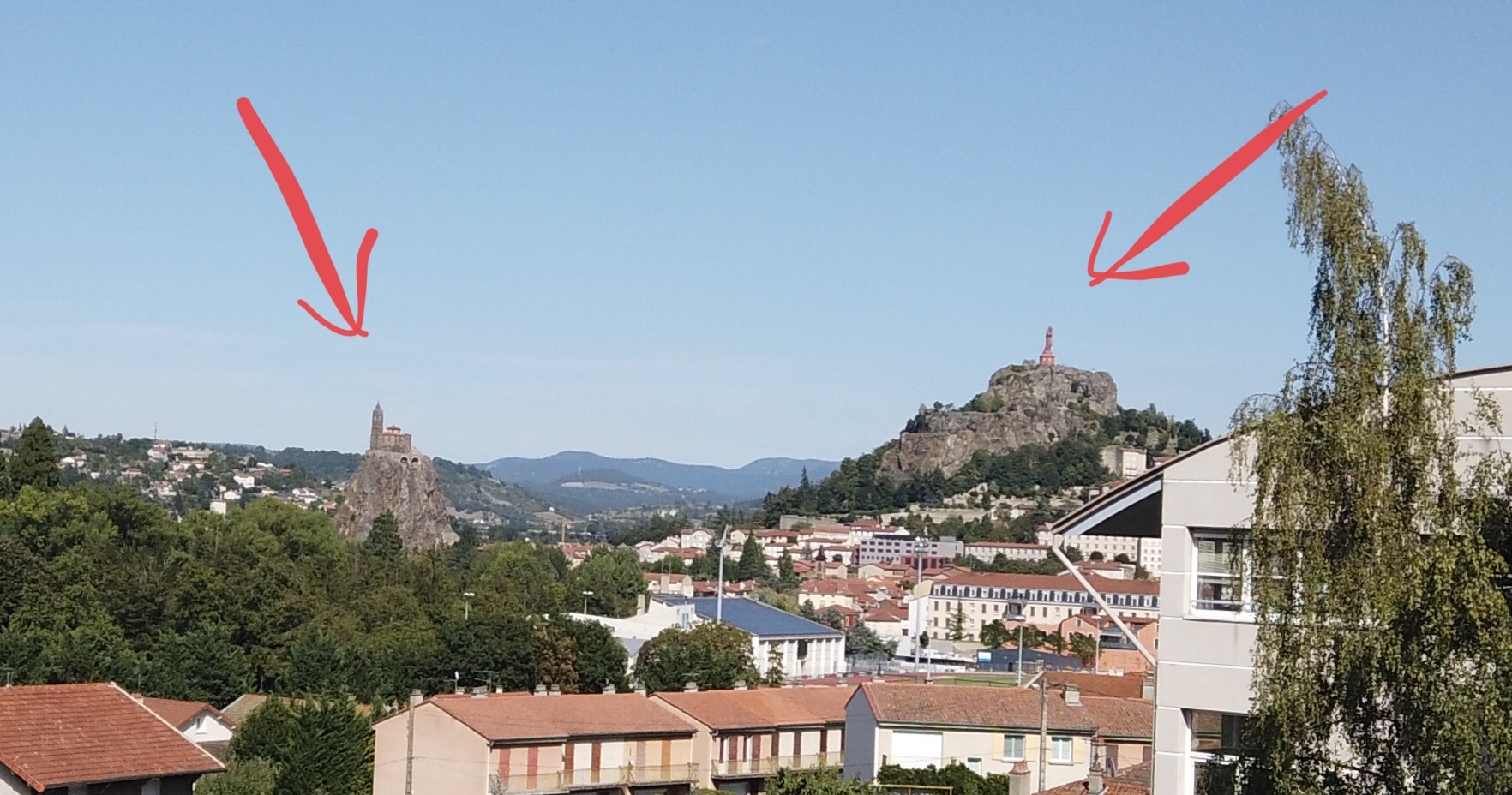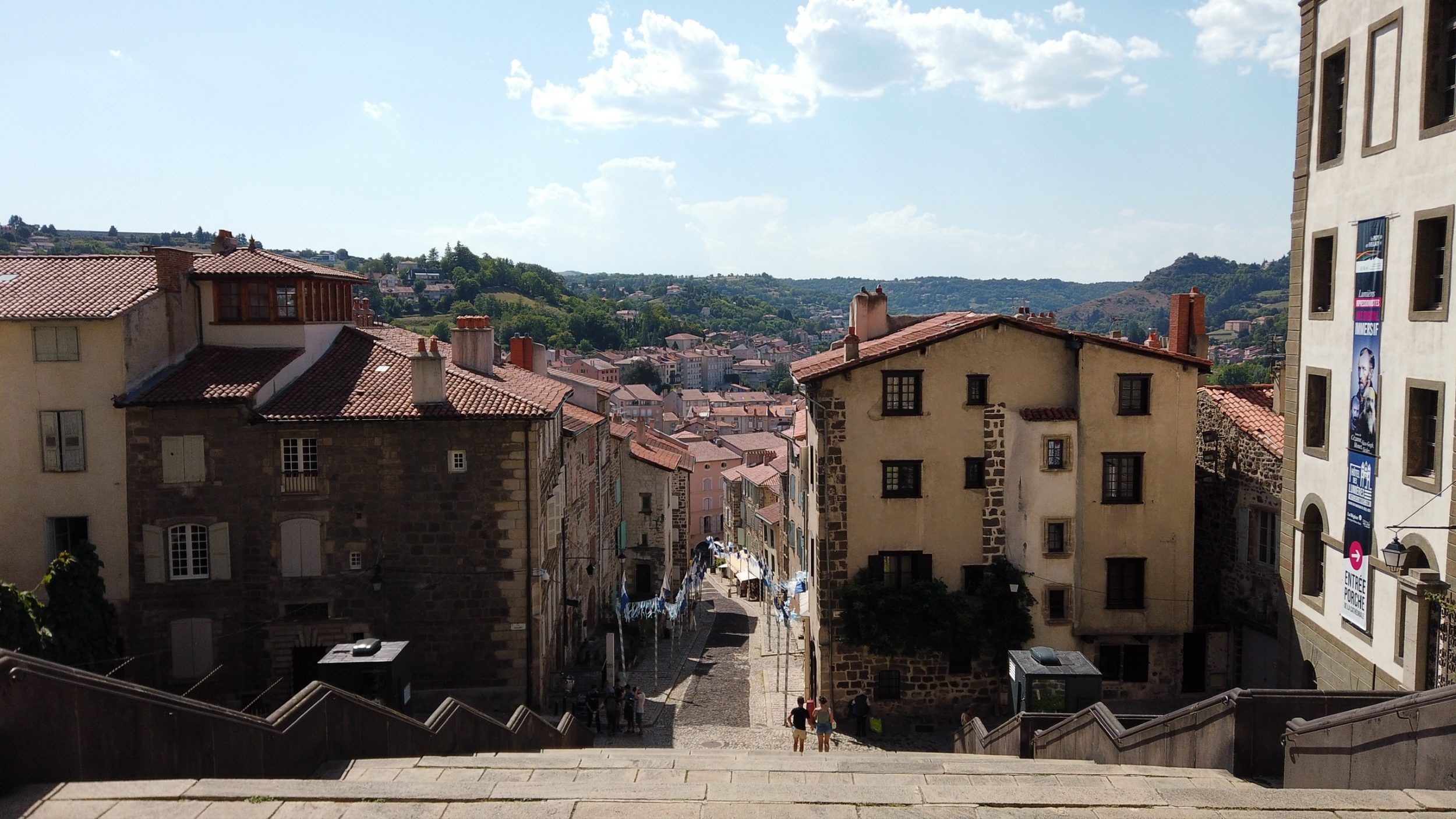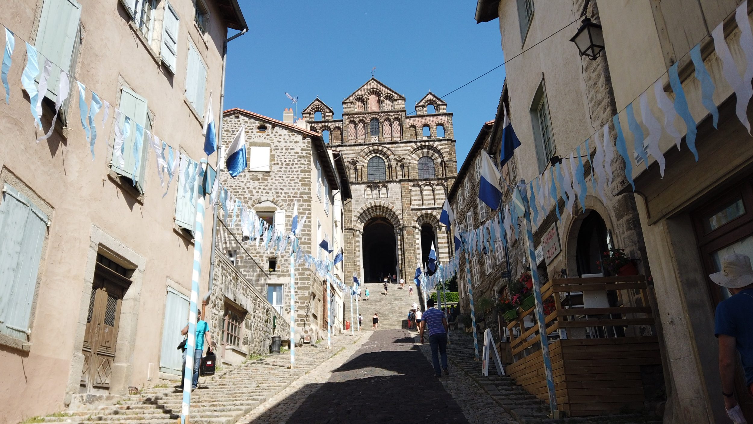 Al llegar a Le Puy-en-Velay, no puede perderse la estatua de Notre-Dame de France (a la derecha) ni la capilla Saint-Clair d’Aiguilhe (a la izquierda). Desde la distancia, ambos lugares parecen completamente inaccesibles, pero hay escaleras que llevan a la cima. No subí a la parte superior de la Capilla, pero para la Estatua, como se sube desde la Catedral, que ya está bastante alta, no sufrí demasiado a pesar de la ola de calor.