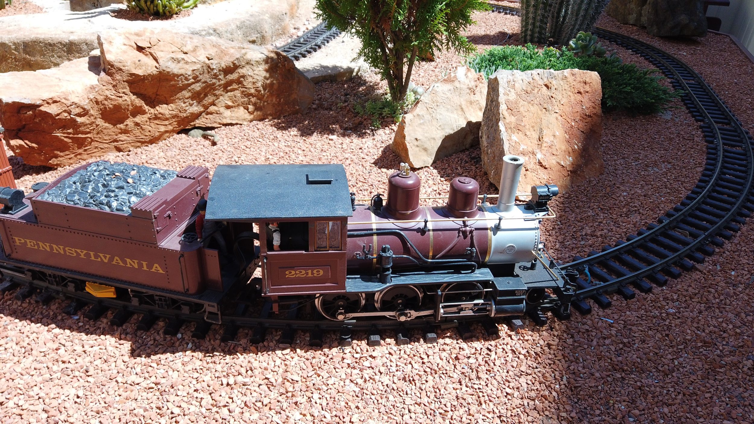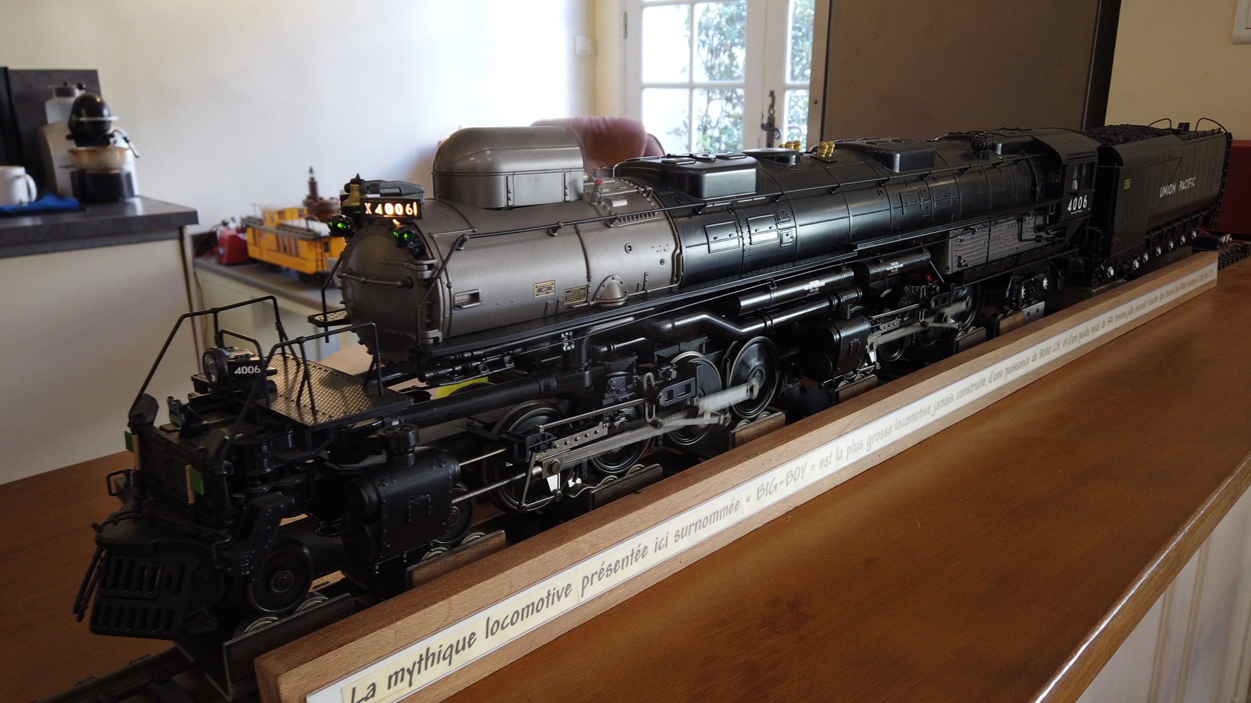 Esta «BIG-BOY» es el Rolls Royce de todas las locomotoras, es sublime. El caballero tuvo la amabilidad de operarlo ante nuestra atónita mirada. Hay una pequeña luz roja que imita al carbón incandescente y un poco de humo que sale de la chimenea. También hace «tchouk tchouk» 😀 ¡Me gusta demasiado! Desgraciadamente, con el recorrido actual, que tiene demasiadas curvas cerradas, aún no se puede ver que pase por la planta baja, pero nunca se sabe.