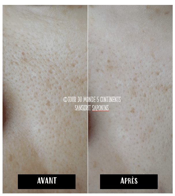 La piel no se tensa en absoluto y después de unos pocos usos, algunos poros han desaparecido, menos problema de poros dilatados (están muy limpios, por lo que ya no se ven).