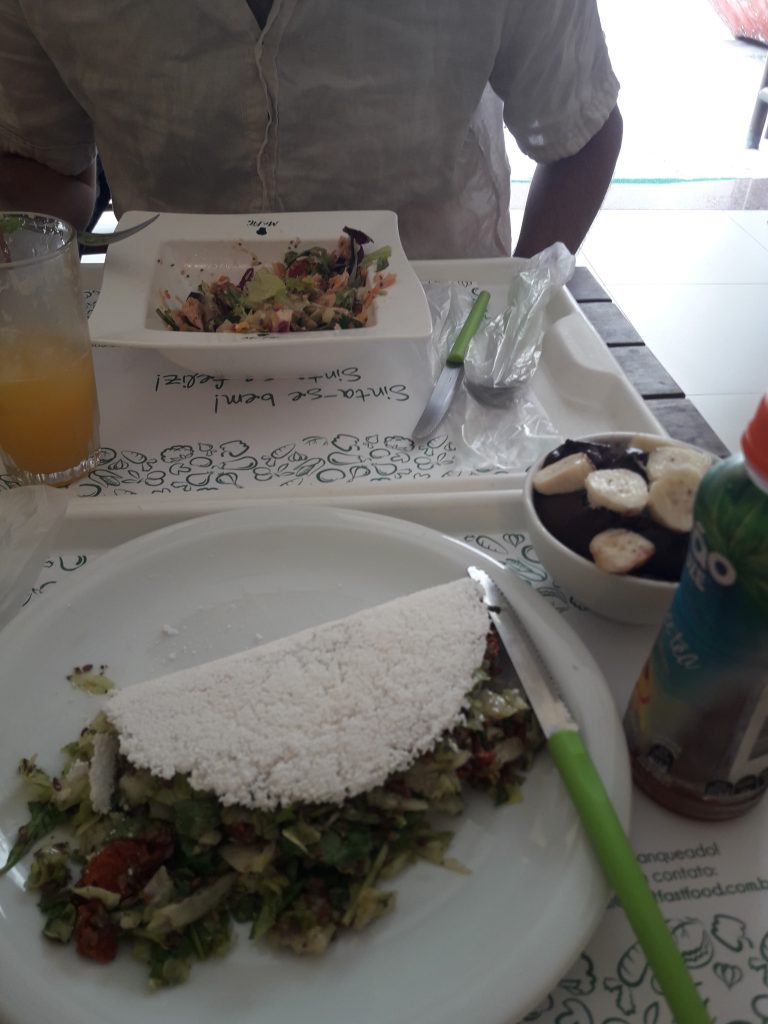 Almorzamos en la barra de ensaladas súper saludables de Mr. Fit. Tenía una envoltura de polvo de tapioca. Es un poco raro, pero el aliño de la ensalada hecho con mostaza y miel está súper bueno (¡nota!). A la derecha, un açai, una especie de batido de fruta de açai con rodajas de plátano por encima. Todavía no me acostumbro a este postre, que sigue siendo comestible