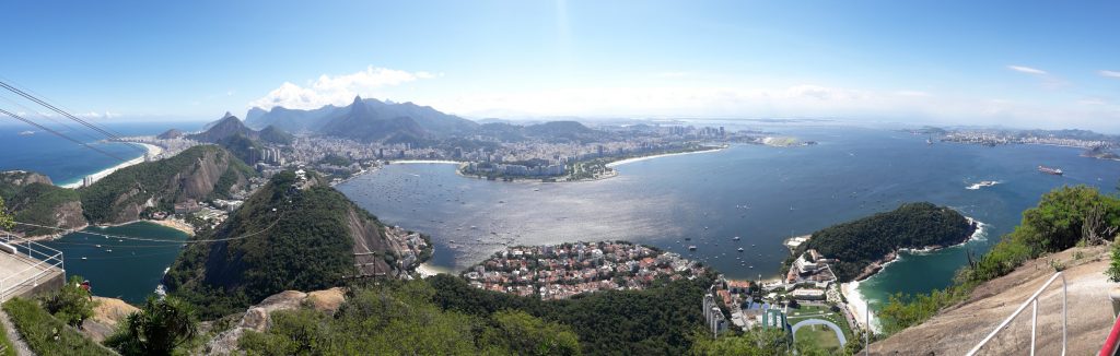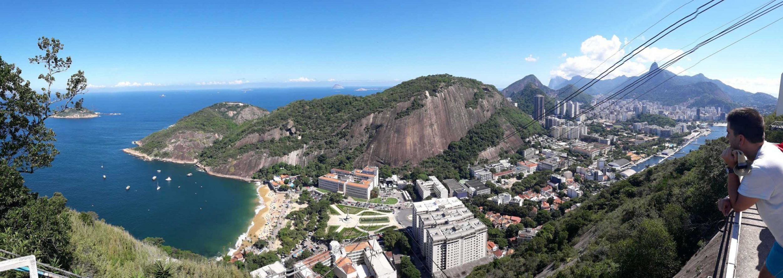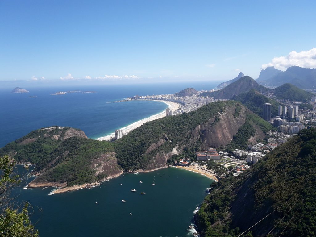 Tomamos un segundo teleférico (incluido en la entrada) hasta la cima del Pan de Azúcar. La vista es aún más espectacular ya que podemos ver la playa de Copacabana. Sí, sí, es exactamente como en las postales, kilómetros y kilómetros de playa. Desde este punto de vista se pueden ver aún más lejos y más playas. Pues bien, los cariocas tienen mucho donde elegir cuando se trata de playas paradisíacas. Puedes ver a Cristo desde lejos, el mar y el cielo son uno, es hermoso, sublime, irreal