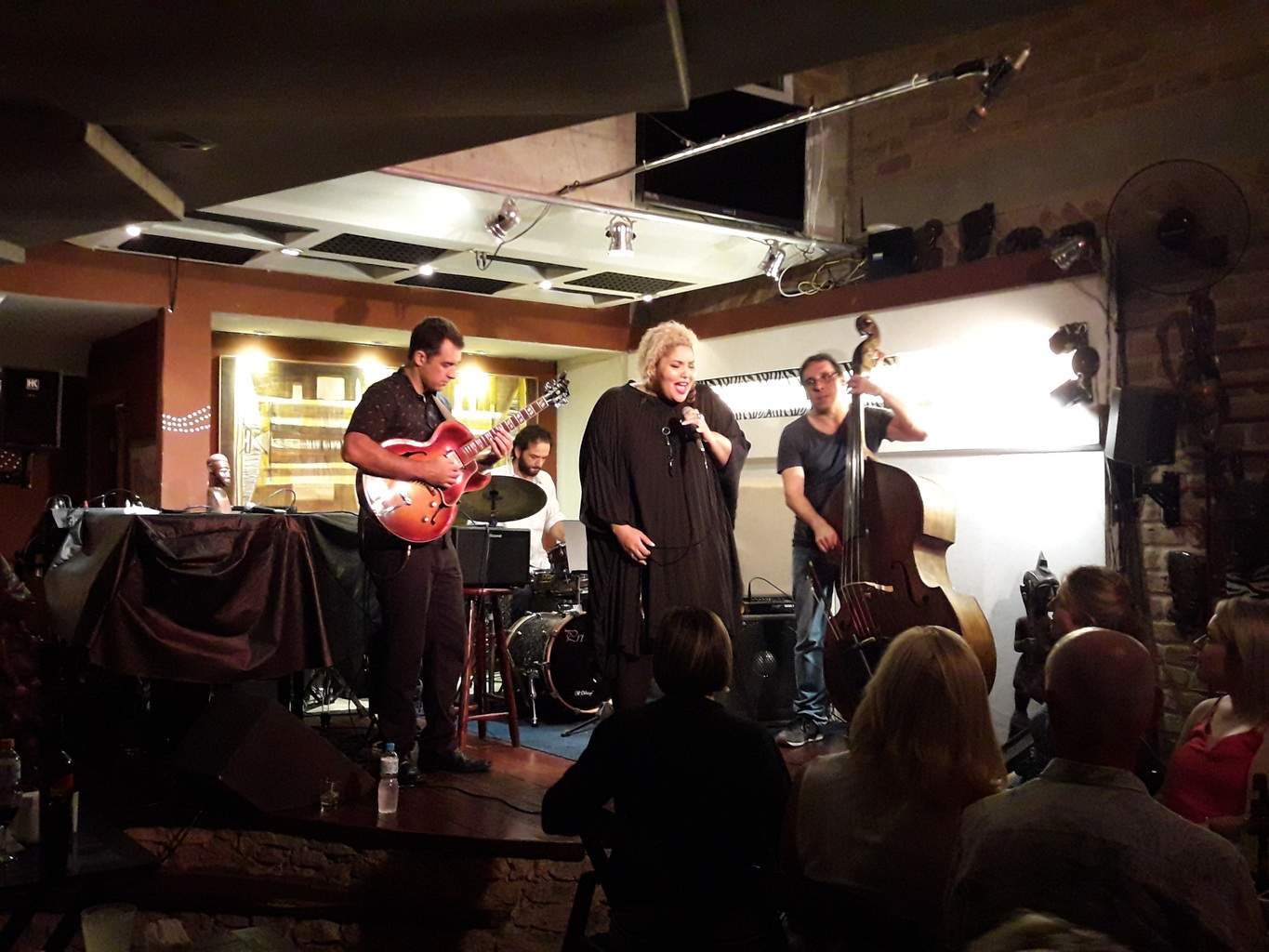 Vamos a tomar un Uber para llegar allí. El barrio tiene mal aspecto, con muchas prostitutas en la calle. El exterior del bar es banal, pero nada más entrar nos sorprende la decoración chic-tribal . El precio de la entrada es de 30 reales/persona, sin incluir la consumición. La cantante, Alma Thomas, es una habitual del bar, es americana, canta divinamente, habla portugués como una auténtica brasileña y domina varios tipos de jazz (blues, bossa nova, bebop). Me gusta mucho el espíritu del bar: uno de los propietarios (un australiano) habla antes del concierto para insistir en que se trata de un concierto, no de un bar con música en directo. Por lo tanto, está prohibido hablar durante el concierto -> recomiendo al 100%