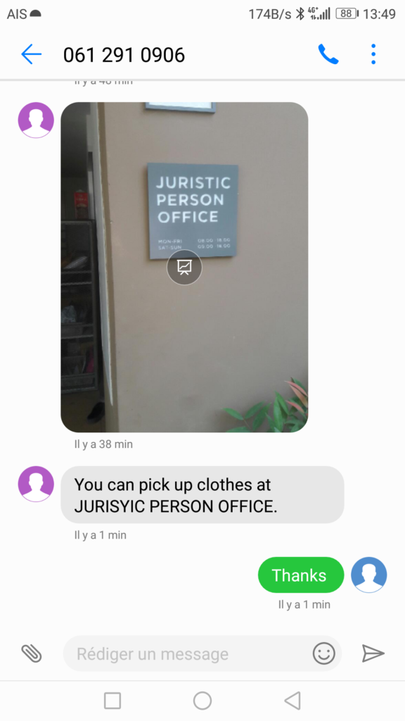 Para la devolución de la ropa blanca 48 horas después, la persona acudió una hora antes de la hora prevista. Intentó llamarme, pero yo estaba en mi scooter. Luego me envió un mensaje de texto para informarme de que había dejado la ropa sucia en la recepción. Incluso me envió una foto para asegurarse de que sabía dónde recogerlo.