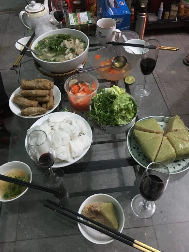 En su casa, en cambio, todo se hace de forma tradicional, tenemos la comida tradicional con todos los platos necesarios (pastel de arroz pegajoso verde, salchicha vietnamita, varias frutas, sopa de brotes de bambú, etc.). Así que, con una enorme barriga, nos dirigimos a ver a mi madrina, antes de ir al Lago de la Espada Restaurada, como todos los demás.
