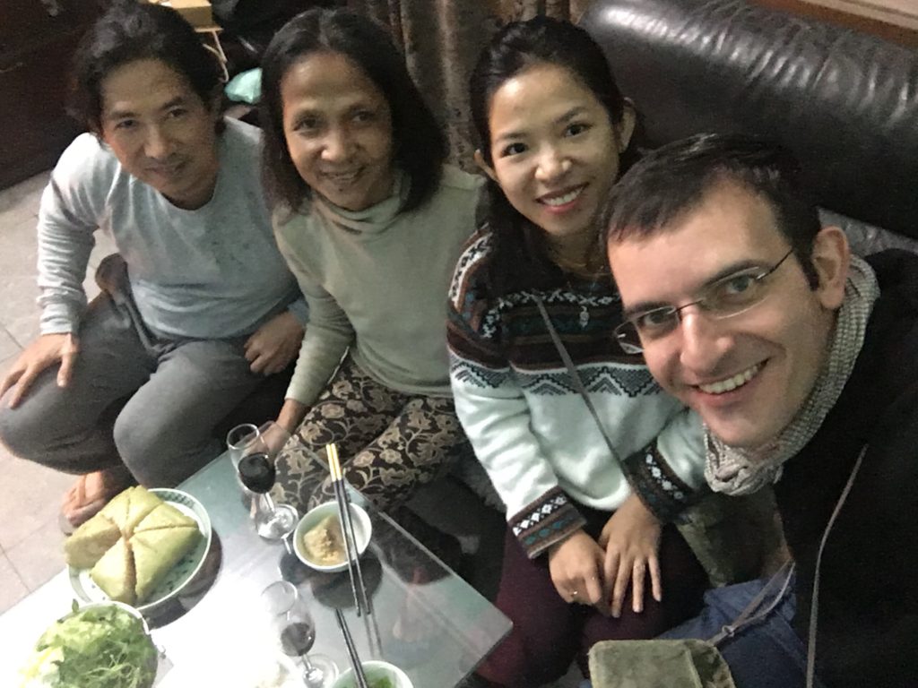 Así que, como os decía, el primer día del nuevo año, nos damos un gran paseo en scooter (JB conduce muy bien en Vietnam) para ver a nuestra familia cercana. Cada vez que vamos a un sitio, nos reciben muy bien y nos sirven aperitivos (té, mermelada). Como JB no habla vietnamita, se aburre y come sin parar. Después de varias etapas, cuando llegamos a casa del hermano de mi madre para comer, ya no tenemos hambre.