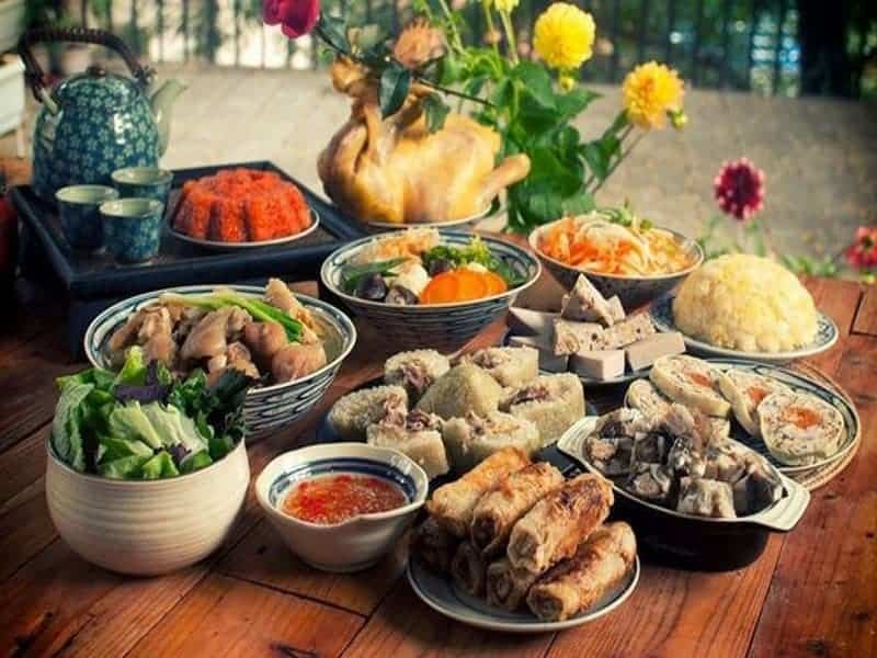 En primer lugar, hay que preparar una verdadera comida para los muertos, que se pone en el altar de los antepasados: 5 frutas diferentes, el pastel de arroz pegajoso verde(bánh chưng), un gallo cocinado de la cabeza a los pies (un gallo, no una gallina, ¡muy importante!).