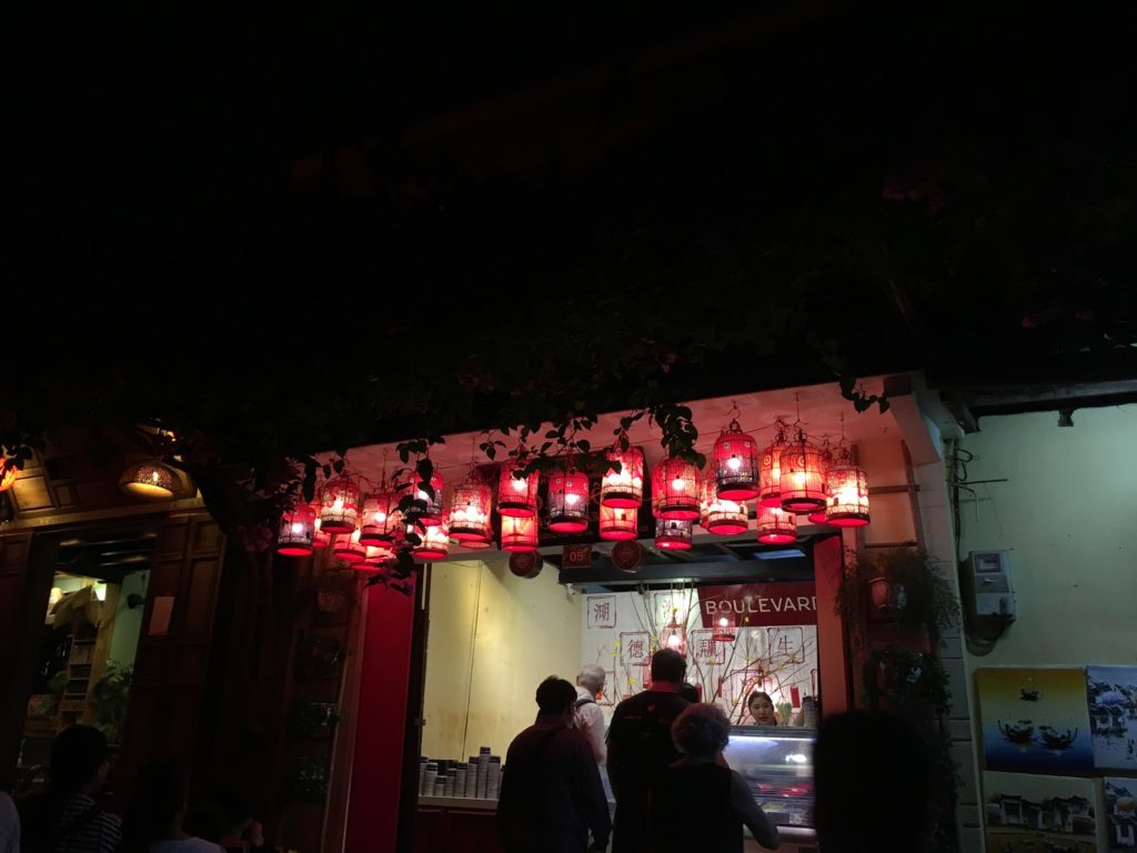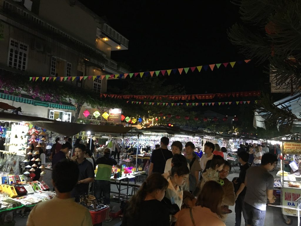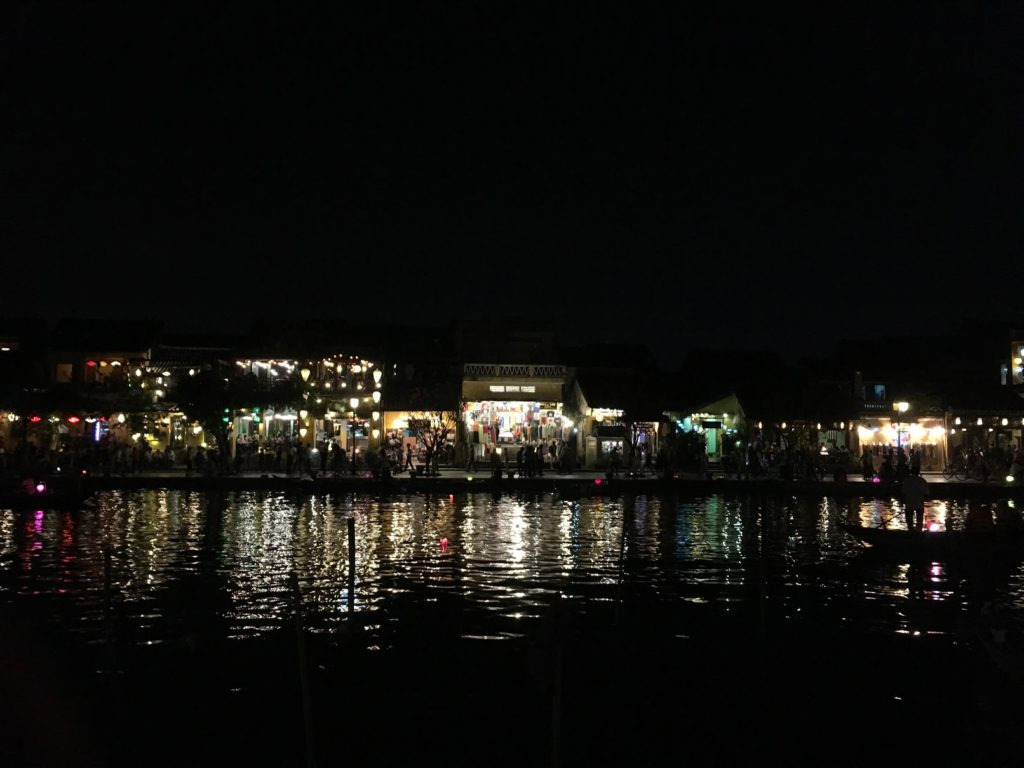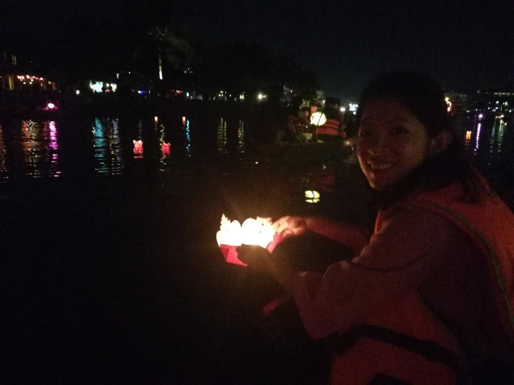 Podemos pagar una barca (120.000VND para dos después de negociar), con farolillos de papel incluidos, para ir a depositar los farolillos y nuestros deseos en medio del río. Esta práctica proviene de una triste historia: el niño que se fue al mar nunca volvió. Y su novia, que aún le espera, envía estas linternas (y sus pensamientos) a través del río, para que lleguen al océano, donde estaría su amante.