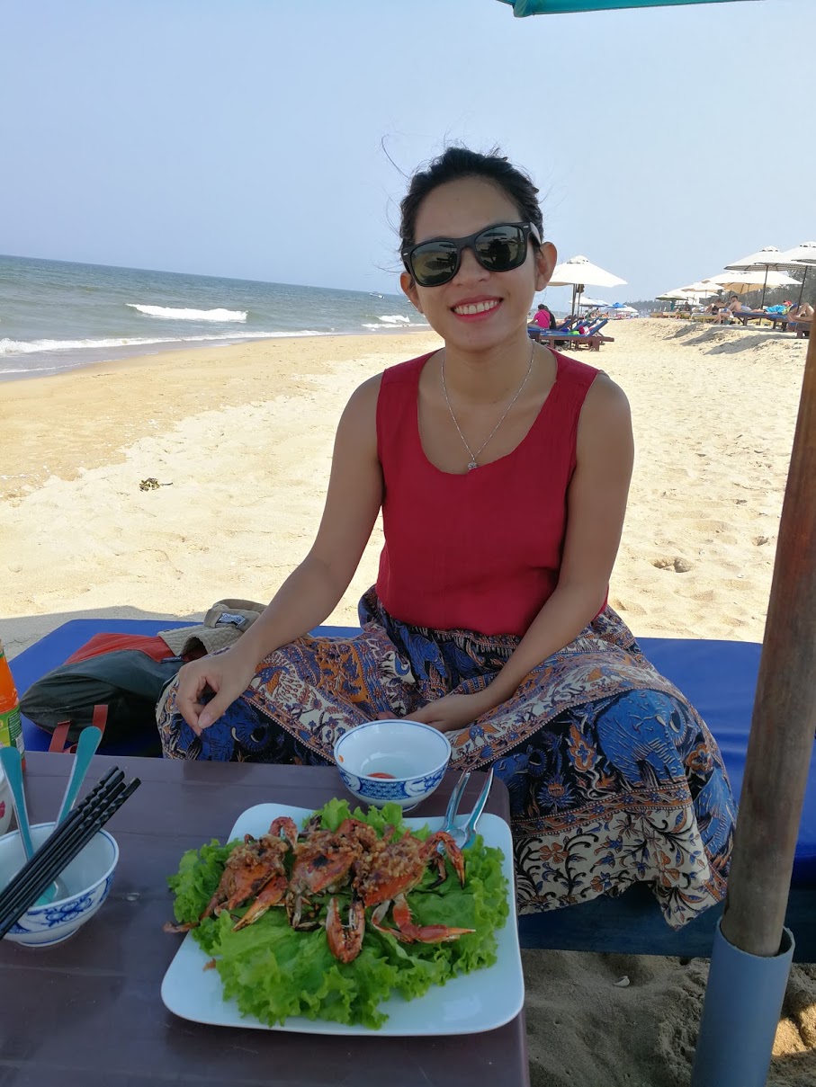 Pero la segunda vez, localizamos una entrada 100m más allá y almorzamos en la playa, por mucho menos (de ahí mi cara de felicidad en la foto) 95.000VND por un gran plato de cangrejos pequeños).