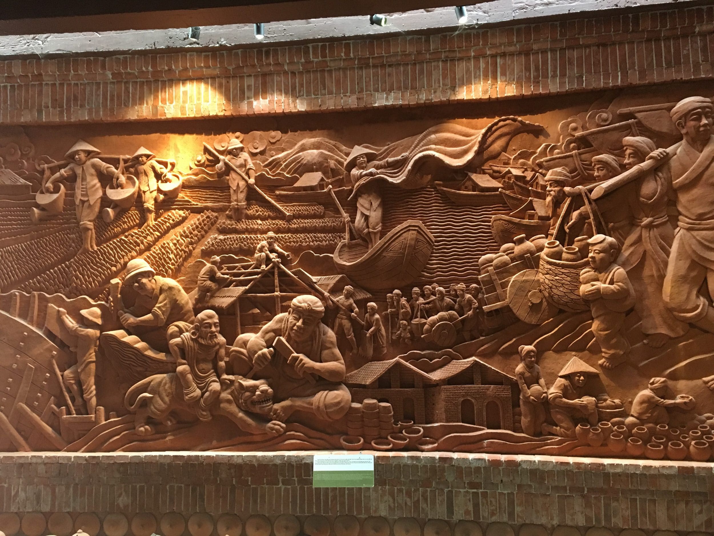 Continuamos nuestro camino hacia el pueblo de la cerámica, visitado por autobuses enteros de turistas asiáticos por la tarde. La entrada al pueblo cuesta 15.000VND/persona, e incluye una pequeña clase y la fabricación de un jarrón de cerámica (que, sin embargo, no podemos llevarnos a casa). Como ya hemos visitado aldeas similares (especialmente cerca de Ha Noi), nos dirigimos directamente al Museo de Terracota (escriba Terracotta Parks en Google Maps), un museo nuevo y muy bonito cuya entrada sólo cuesta 30.000VND/persona.