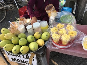 No te olvides de probar las diferentes frutas en el mercado nocturno. Los mangos se venden maduros o verdes, preste atención al color del mango. En esta foto, los mangos cortados son de color amarillo pollito => todavía verde