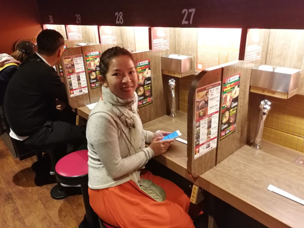 Hoy descubrimos el verdadero ramen japonés. Jb ha visto un conocido restaurante en el que se pide a través de máquinas y luego se sienta en un compartimento individual para comer. Hay un cartel con colores amarillo/rojo/verde que indica si hay asientos libres o que pronto lo estarán. Mientras tanto, indicamos nuestras preferencias marcando con un círculo las opciones (fideos aldentes o blandos, mucha pimienta o no, cebolla o no…)