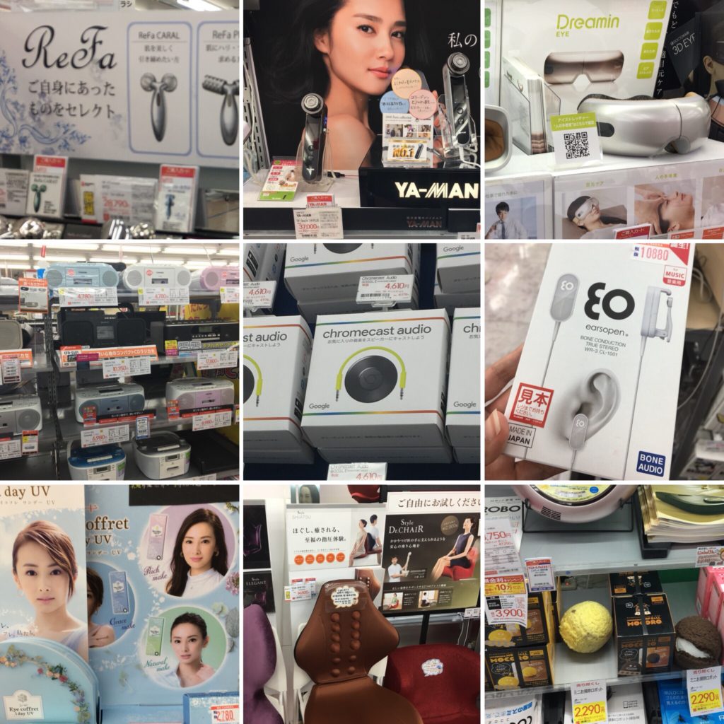 Las máquinas refa que dan la línea v a la cara, o las máquinas yaman (masaje, limpieza facial) son los productos estrella en el departamento de belleza. También hay aparatos para relajar los ojos, reproductores de casetes antiguos, chromecast de audio (para altavoces sin bluetooth), auriculares para enganchar a las orejas como si fueran pendientes, lentes de contacto para agrandar la pupila, colchones para poner en cualquier silla para la espalda; y pelotas que ruedan para atrapar el polvo