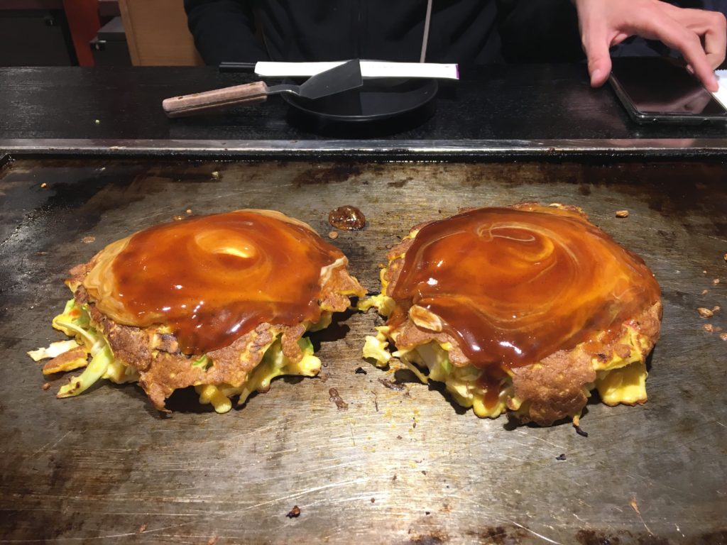 Al día siguiente, vamos al restaurante Ajinoya, muy famoso por el okonomiyaki, una especie de tortilla. La única pega: esperar 45 minutos en la cola. Cada uno elige un chiaka-konomiayki con palitos de arroz pegajoso en el fondo. La experiencia me parece divertida, pero no me ha engañado la calidad y el sabor