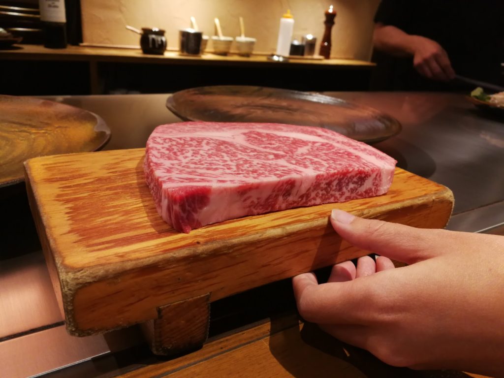 Nos colocamos en el mostrador, frente a la placa de cocción. Nos dan un delantal para proteger nuestra ropa de las salpicaduras de aceite. Y nos presentan la pieza grande de 280g de calidad A5, que pedimos para dos