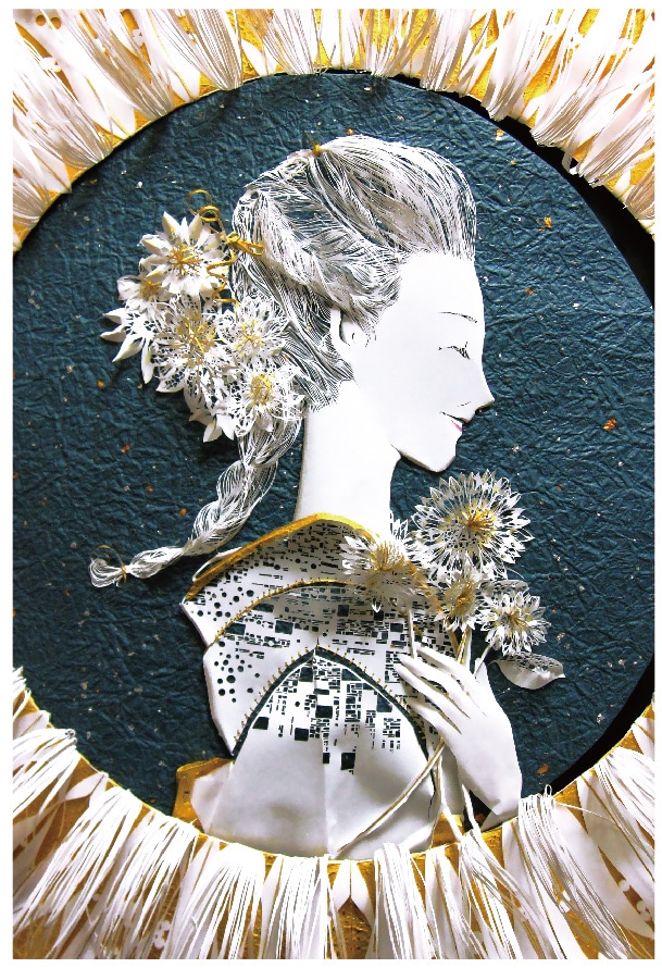 ¡Souma hizo esto! Así que me apresuré a comprar su libro (立体切り絵作家SouMaの 初めてでもできる立体切り絵). Muestra cómo hacer joyas de papel y cortar plumas.