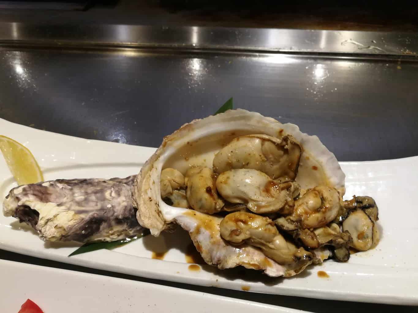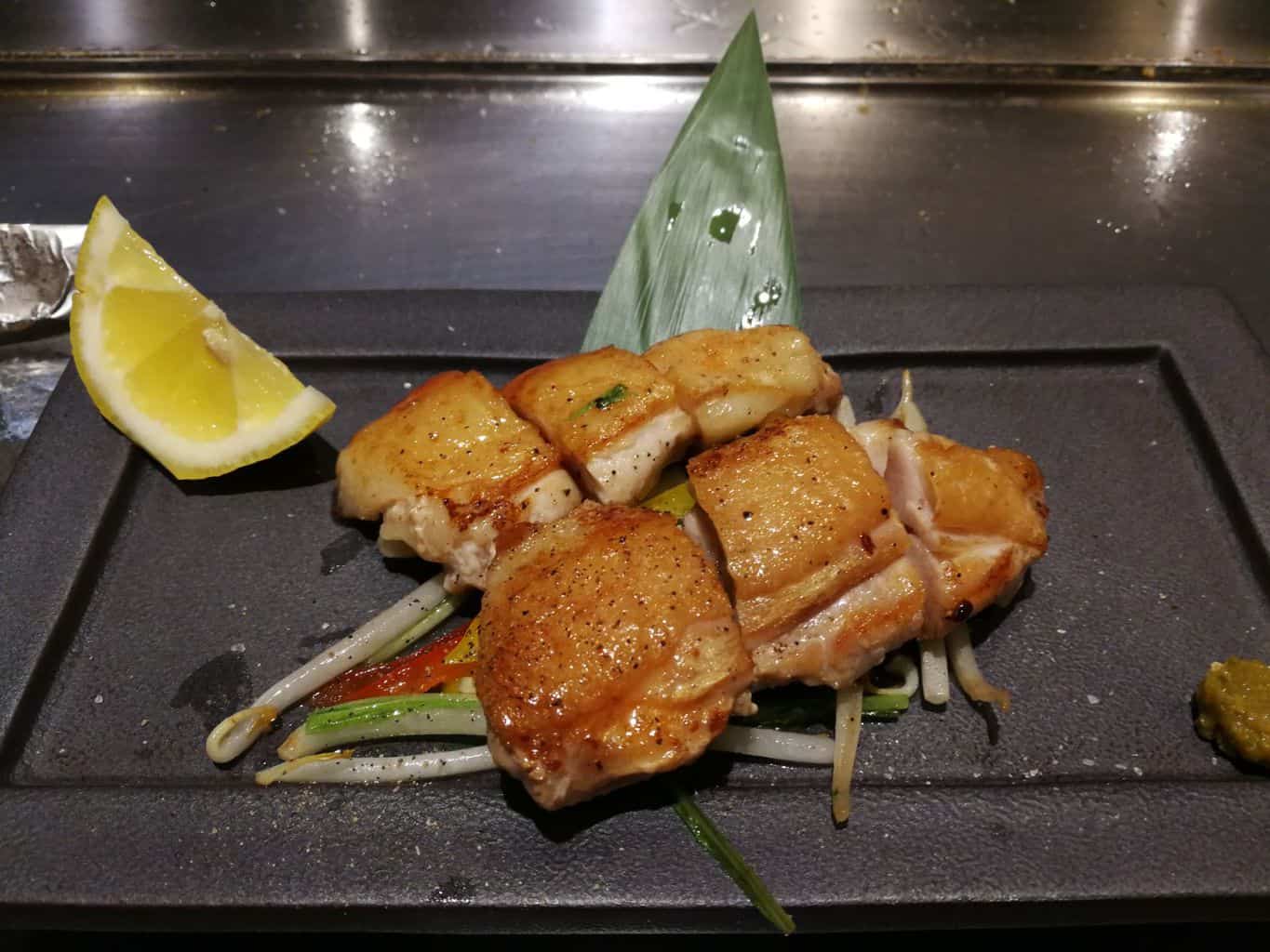 La carne aquí es de origen japonés. Cuesta unos 1.000 yenes por 100 g y 1.450 por 150 g. He cogido algún trozo de 150g y no sólo está cocinado delante de mí en una plancha caliente por el chef, sino que está tan jugoso, tan bueno