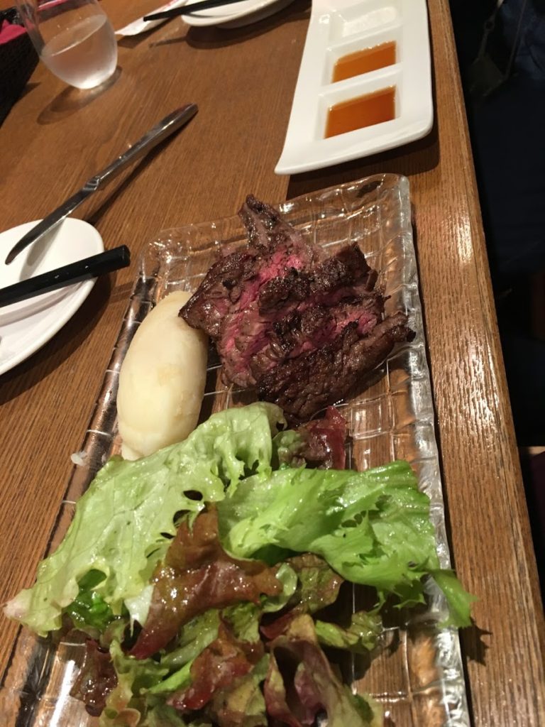 Una entrada está gravada y se cobra 400 yenes (algo) por persona. Podemos elegir entre una ensalada y un carpaccio. La primera vez que vinimos, a JB le molestó un poco esta «venta forzosa», pero luego entendimos que era una práctica bastante común en los restaurantes de carne