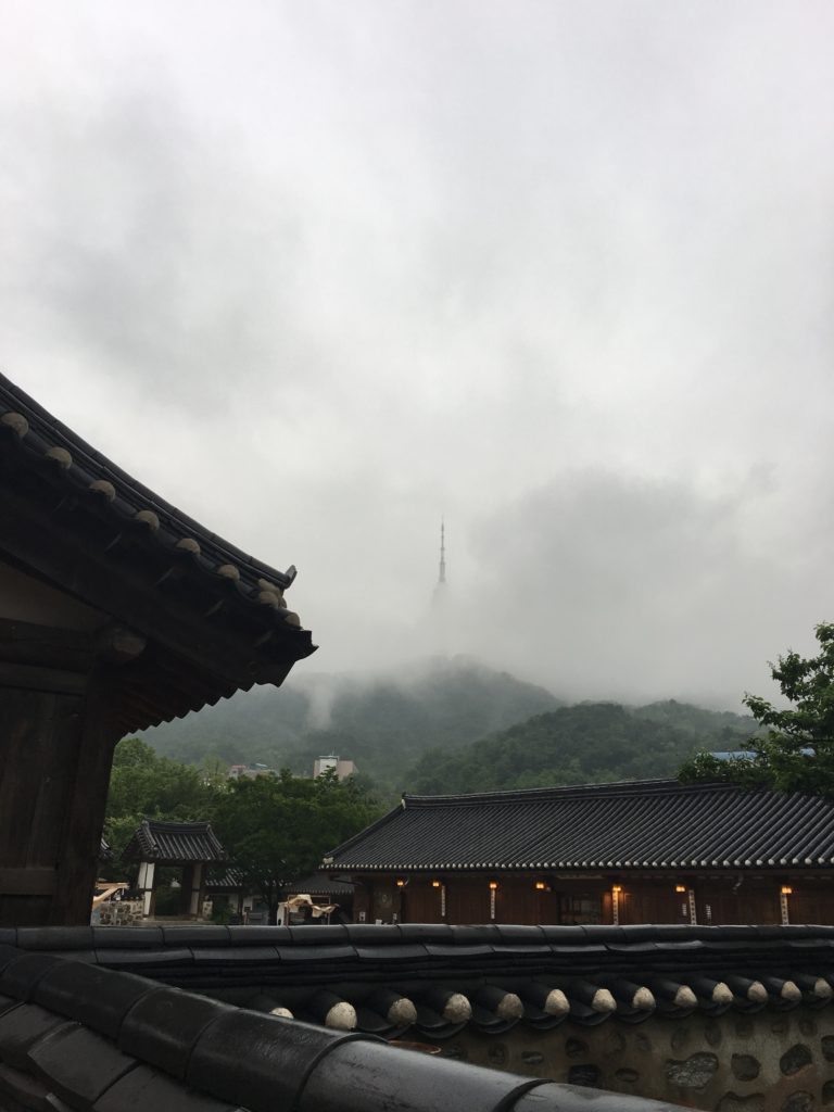 Desde aquí se puede ver la Torre Namsan oculta por las nubes. Es bastante divertido caminar entre los hanoks y ver grandes edificios en la distancia