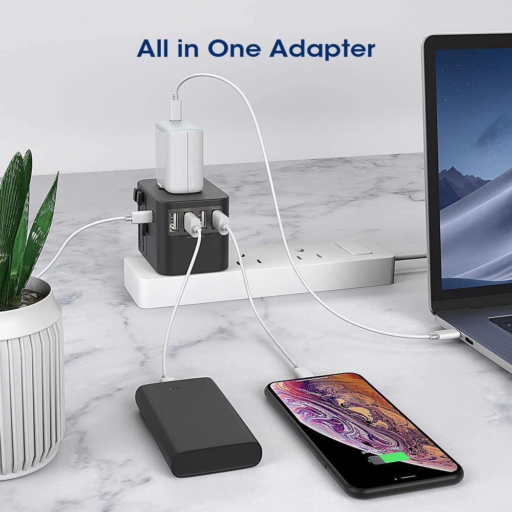 No hace falta decir que el adaptador universal es ESENCIAL Nuestro modelo(26€ en Amazon) cuenta además con 4 tomas USB + 1 tipo-C, por lo que podemos desechar los trozos de adaptadores suministrados con nuestros equipos, que no nos servirán de mucho al otro lado del mundo.